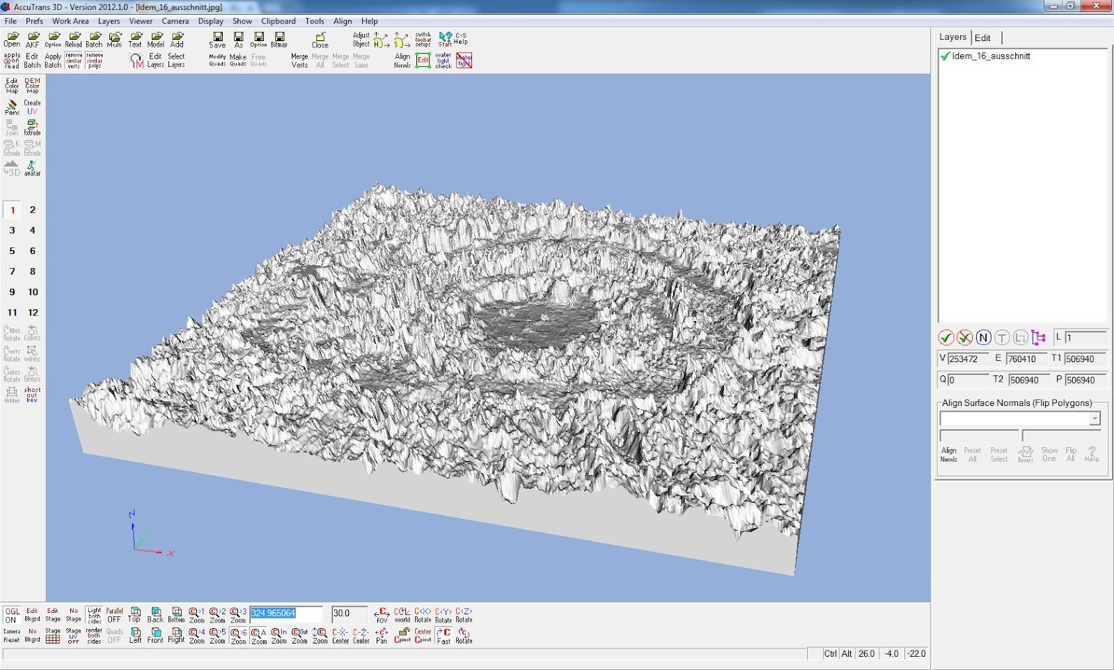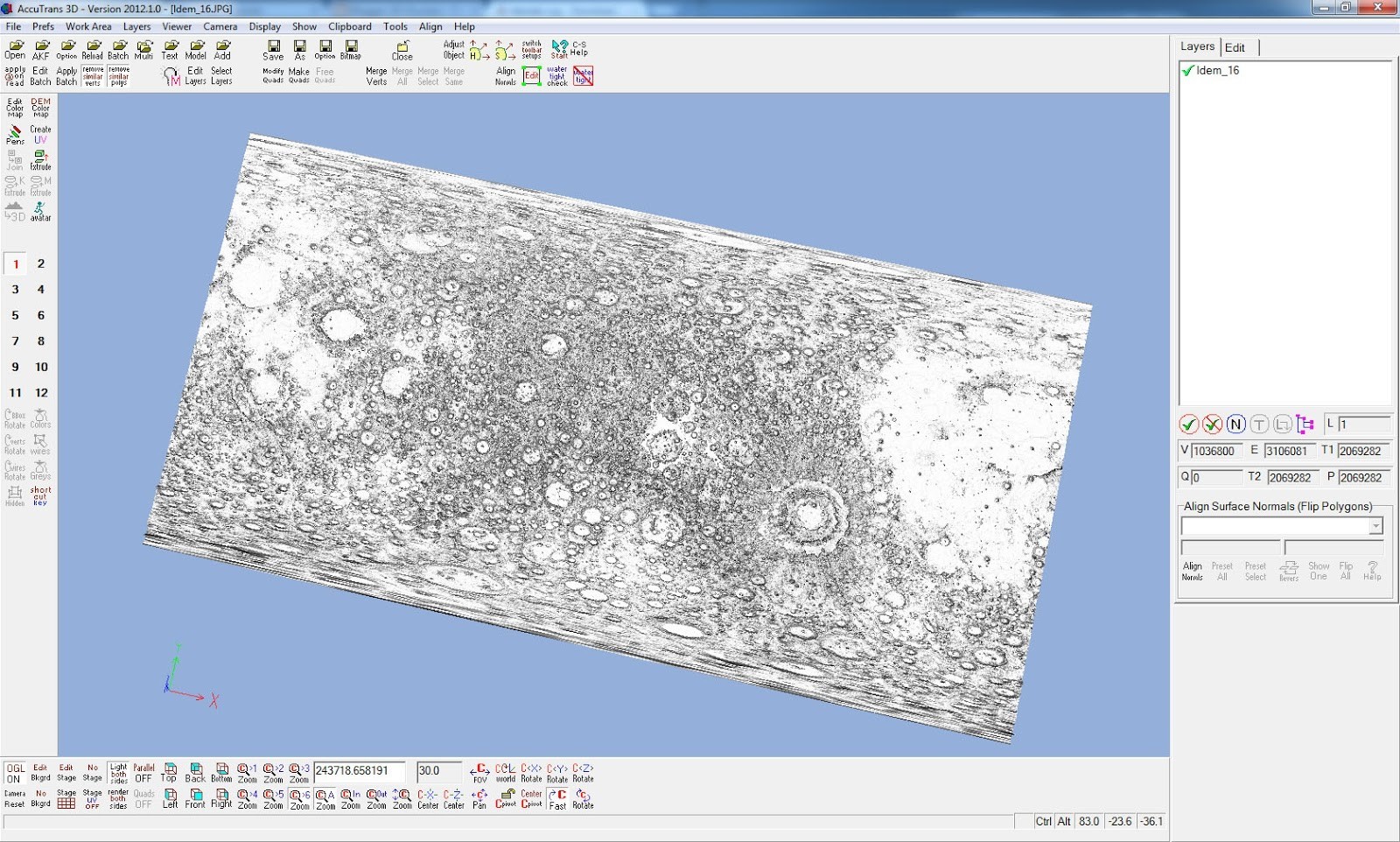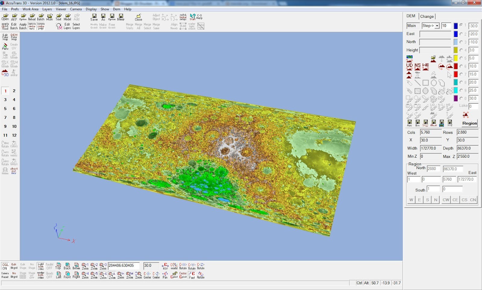 Öffnen konnten wir die Daten nun mit NASAView, speichern ist allerdings nur als JPEG oder GIF möglich, das hätten wir ja auch so haben können. Um nicht nochmal neu Daten herunterladen zu müssen, schreiben wir aus NASAView eine JPEG-Datei und öffnen diese mit AccuTrans 3D. Wer die IMG-Dateien der NASA anders Konvertieren möchte, könnte dazu auch die FWTools verwenden.