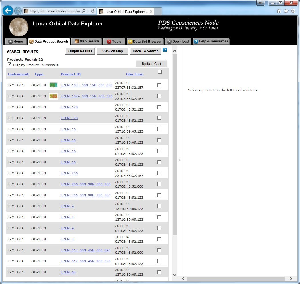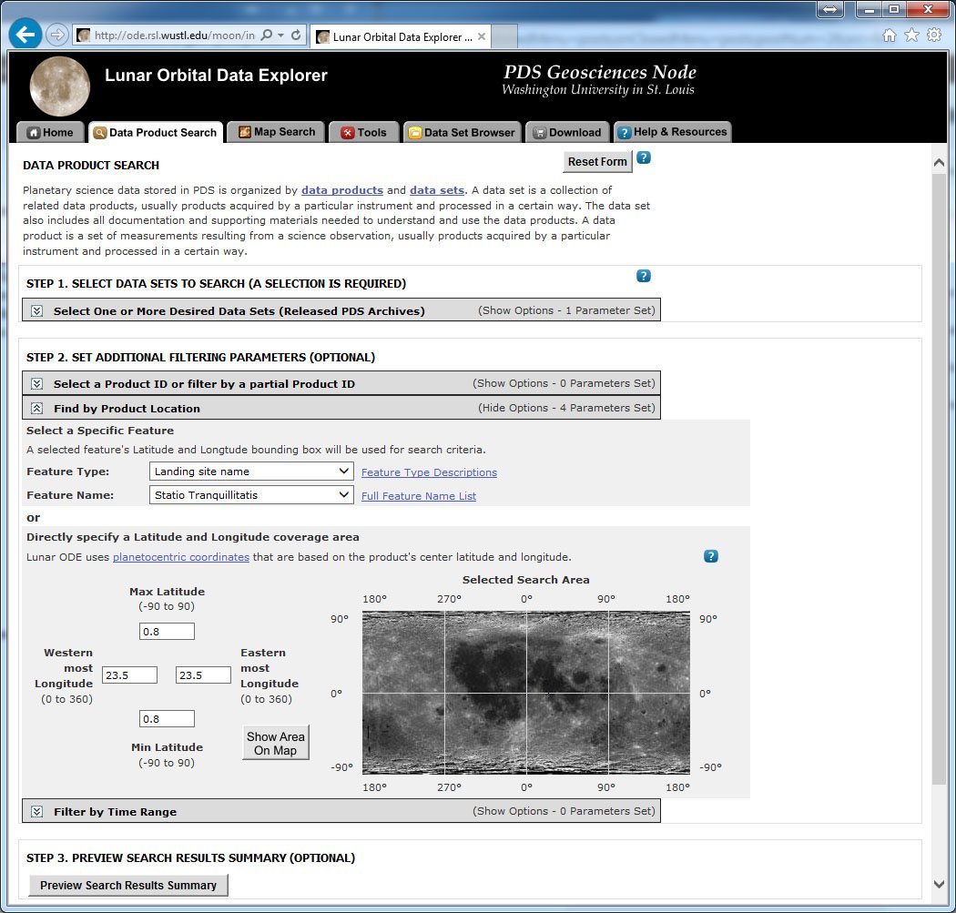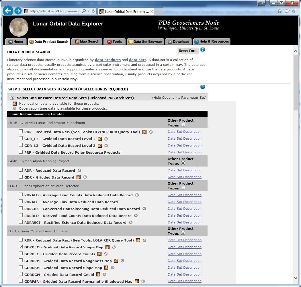 Ohne genauere Kenntnisse haben wir uns einfach mal einen kleinen Bereich ausgewählt, der via http://ode.rsl.wustl.edu/moon/indexproductsearch.aspx unter der Auswahl Landing site name.Statio Tranquillitatis erscheint. Als Datenset wählen wir auf der selben Seite GDRDEM – Gridded Data Record Shape Map des LOLA – Lunar Orbiter Laser Altimeter aus. Ob dies jedoch zum gewünschten Resultat führt, ist nicht klar. Da ist Expertenwissen gefragt.