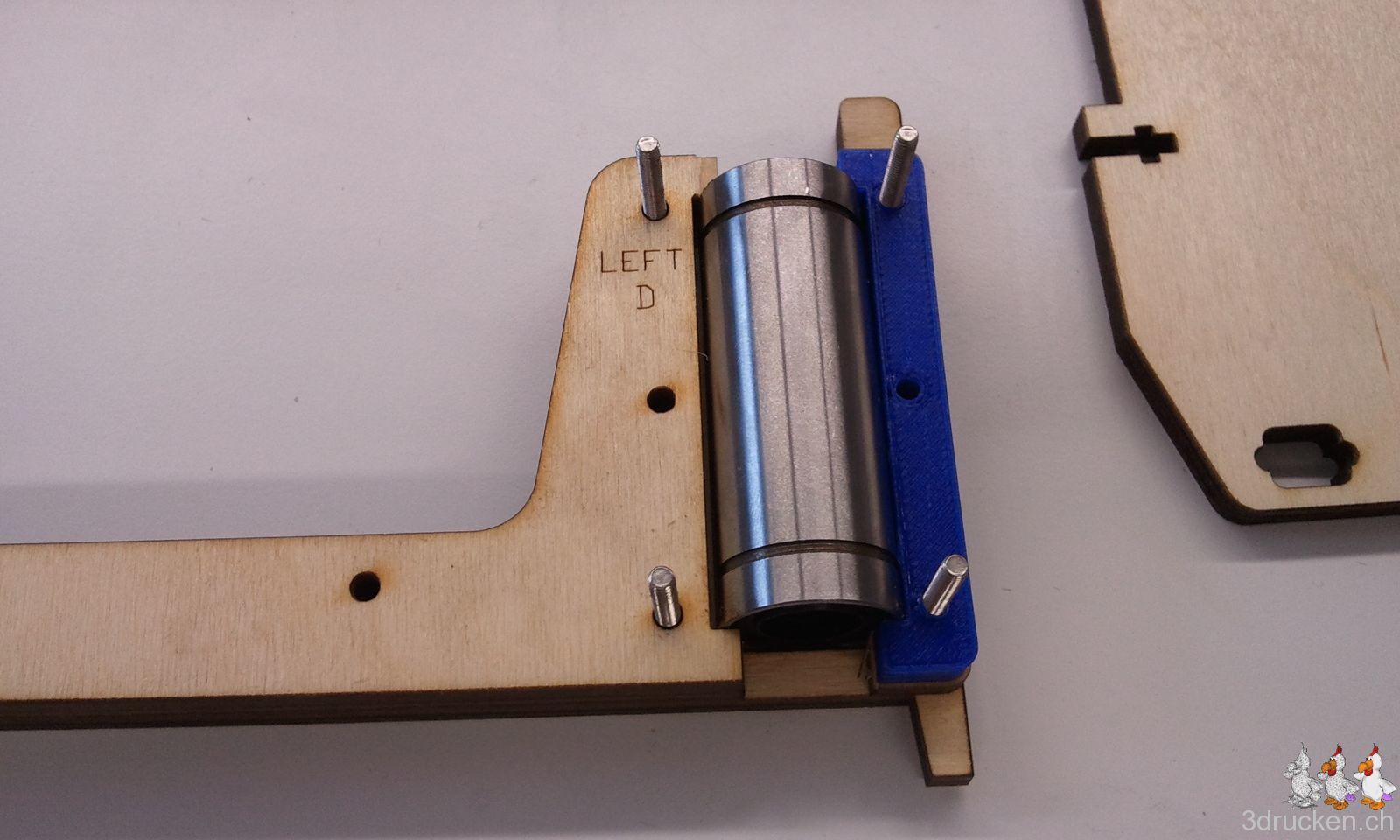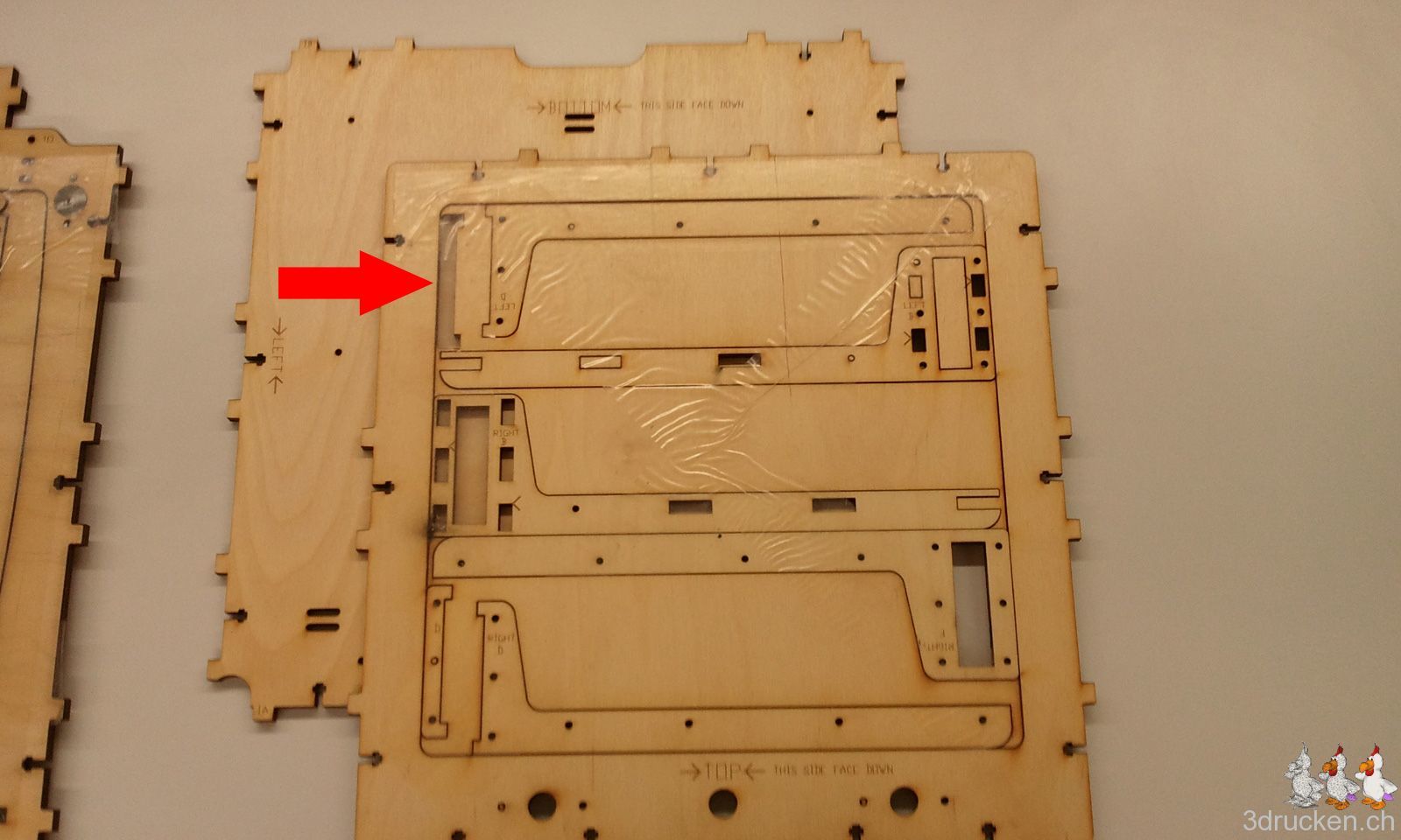 Die Show beginnt mit dem Zusammensuchen der einzelnen Holzteile für den Drucktisch. Wir müssen feststellen, dass eines der kleinen Holzteile, das „Left D“ fehlt. Wir haben zu Beginn der Arbeiten nach dem Auspacken alle Holzplatten fotografiert, und sehen hier, dass das Teil schon da fehlte.