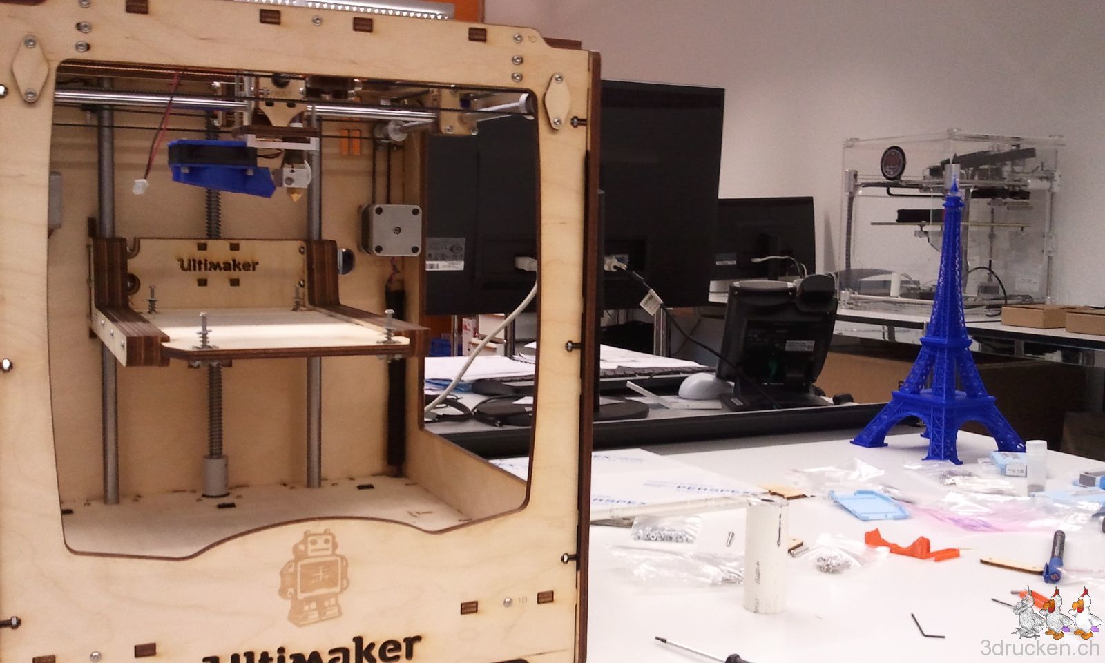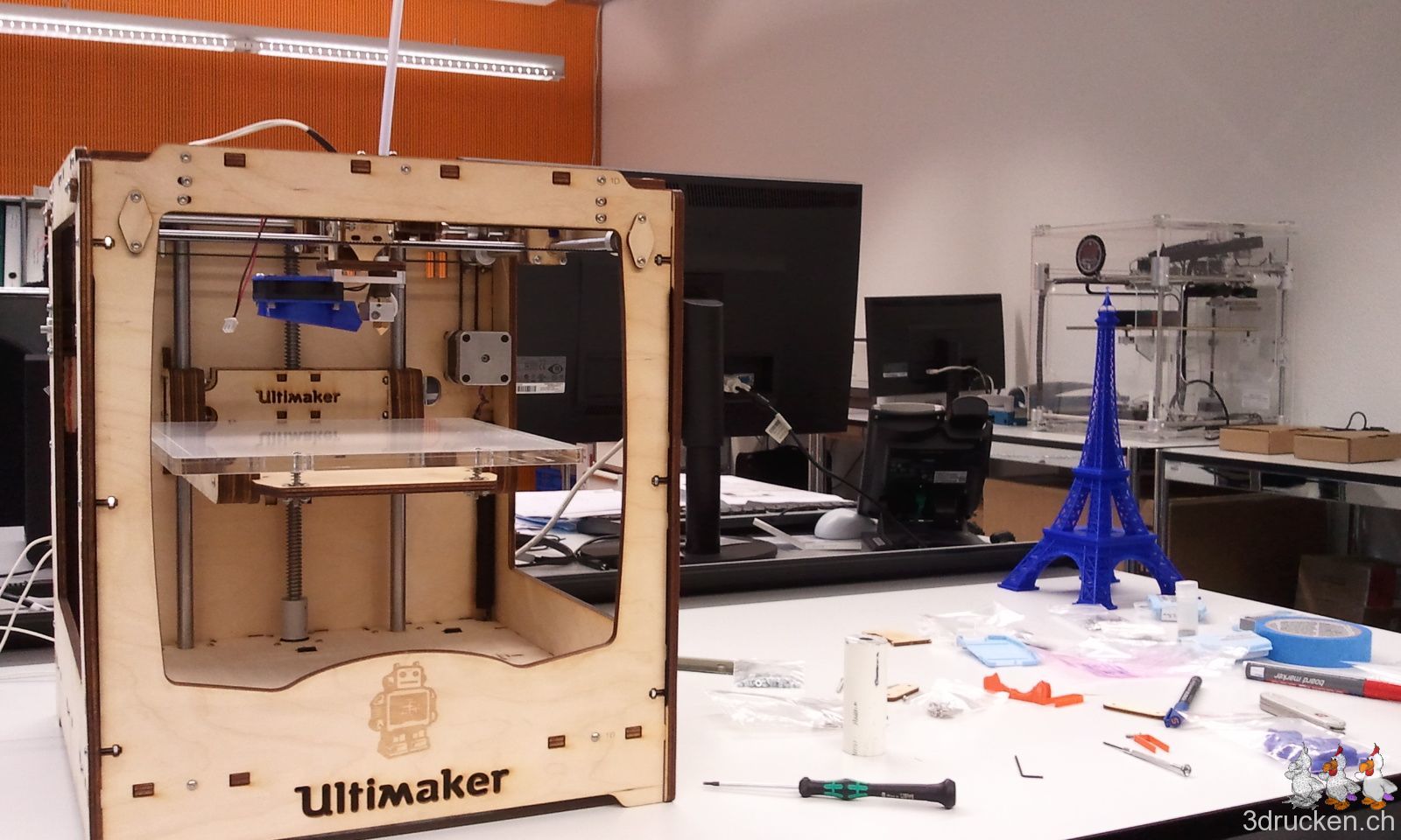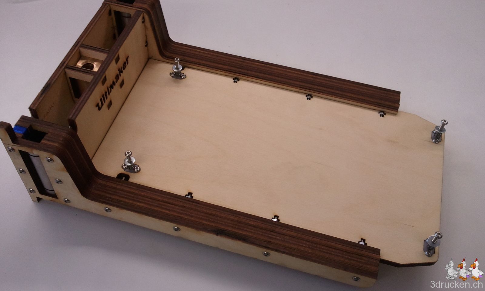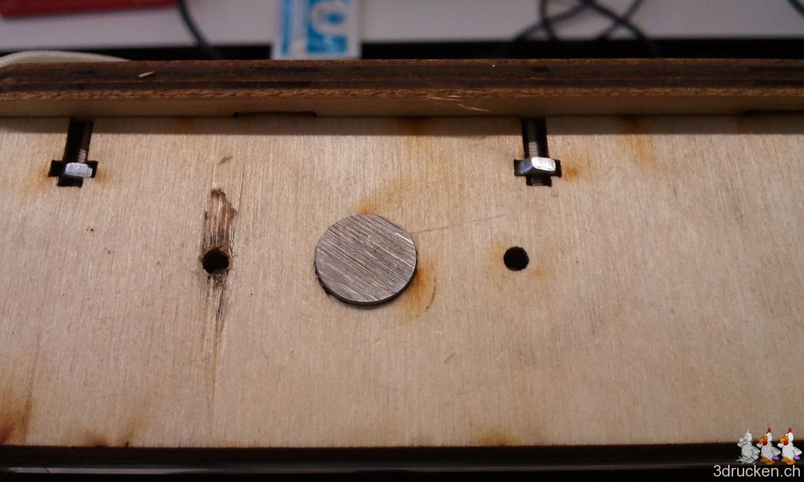 Ein Loch für eine Schraube des Holzdeckels war nicht ganz ausgelasert. Und das kommt dabei raus, wenn man mit unqualifizierten Methoden das Loch dann ganz durchbrechen will. Die Holzdeckel lassen wir weg, an ihrer Stelle wird danach der Tragegriff montiert, den der erste Ultimaker gerade ausdruckt.