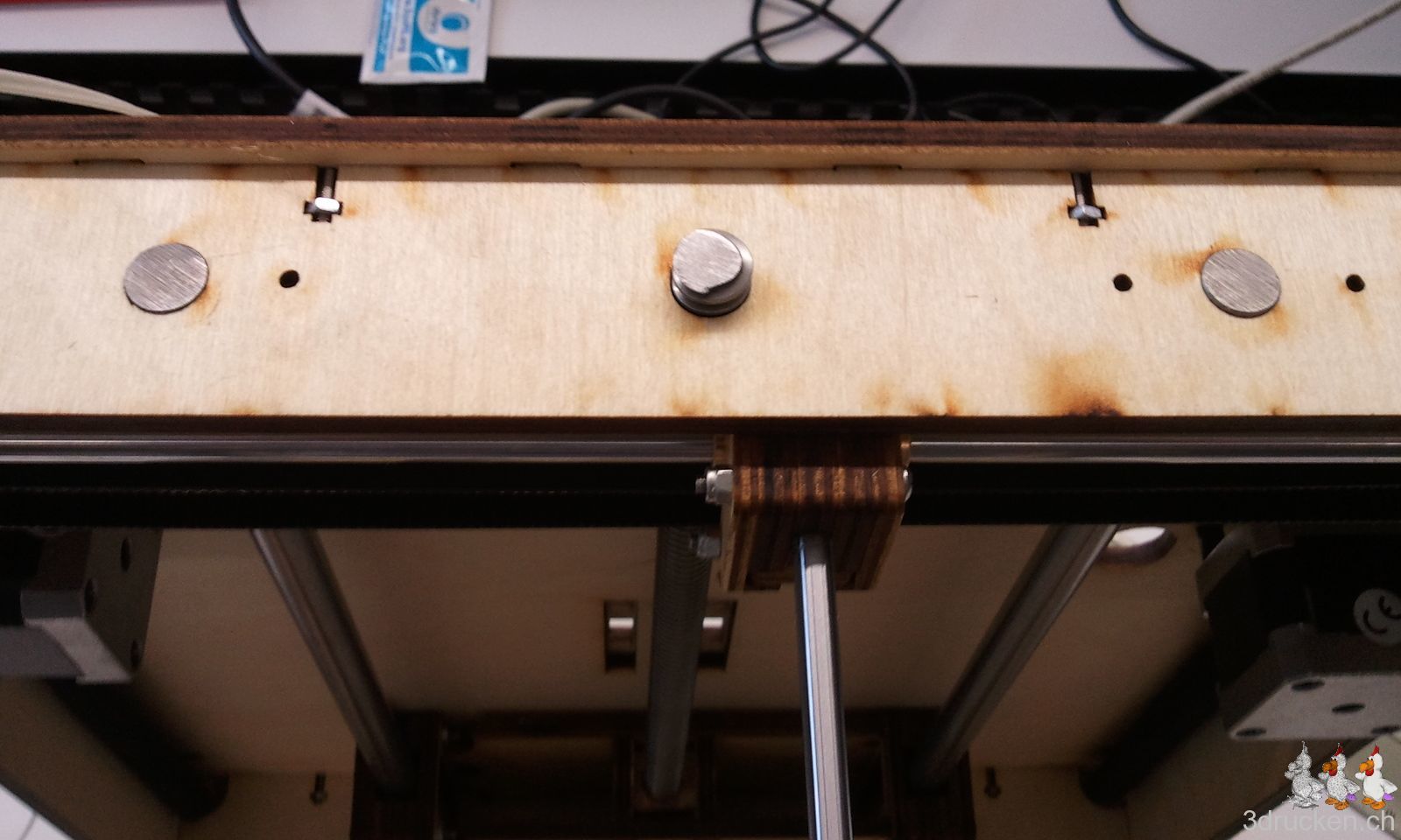 Inzwischen haben wir den Tisch zusammengesetzt, und auch die Metallstäbe der Z-Achse eingesetzt. Für das Zusammensetzen der beiden Arme des Tisches, haben wir uns damit beholfen, die 30 mm Schrauben schon gleich zu Beginn in die Teile einzulegen. Pro Arm haben wir dazu 5 Schrauben verwendet, 4 unmittelbar in der Nähe der Lager, und eine Schraube ganz am Ende des Arms, damit sich die Teile leichter stapeln lassen, und auch nicht wieder auseinander fallen.