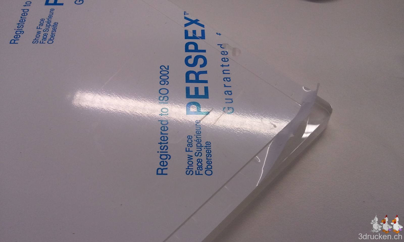 Ebenfalls haben wir die Acrylglasplatte erst ganz zum Schluss auf den Tisch draufgelegt, als wir die Achsen und den Tisch schon in das Gehäuse montiert hatten. So lässt sich der Tisch leichter einpassen. Vom Glas muss noch die Schutzfolie entfernt werden, dann kann der Tisch mit blauem Klebeband beklebt werden, das dient dem Schutz für den Rest des Zusammenbaus. Man kann die Glasplatte aber auch erst ganz zum Schluss überhaupt in den Drucker einlegen, das beeinflusst sonst keinen der restlichen Schritte.