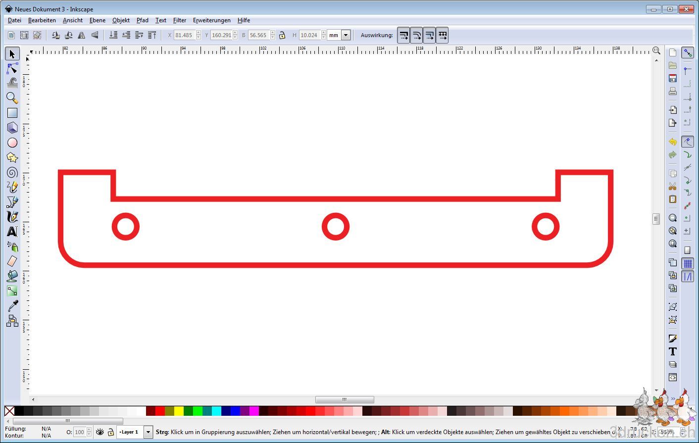 Wir können nun also das identische Teil „Right D“ vermessen, zeichnen und mit dem ersten Ultimaker ausdrucken, oder auf Thingiverse nach den Plänen von Ultimaker suchen und dort dieses Teil rausnehmen. Es gibt die Wenigstens sind wir nach den Plänen sicher, dass das eine Holzstück mit 4mm dünner sein soll als die der Seitenteile. In Inkscape haben wir aus dem gesamten Plan das gewünschte Teil „Left D“ herauskopiert, und in einem neuen Design die Form geschlossen und als SVG exportiert.