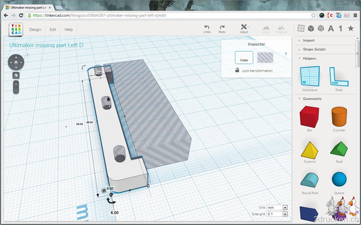 Leider stimmten die Dimensionen nicht, und auch die Löcher waren nach dem Import in Tinkercad verschwunden. Also das „Right D“ vermessen, und in Tinkercad korrigieren. Neu Zeichnen hätte im Nachhinein betrachtet für dieses eine Teil wohl weniger lange gedauert, oder aber man hätte das Teil als SVG in Sketchup importiert, da hätte es besser geklappt.
