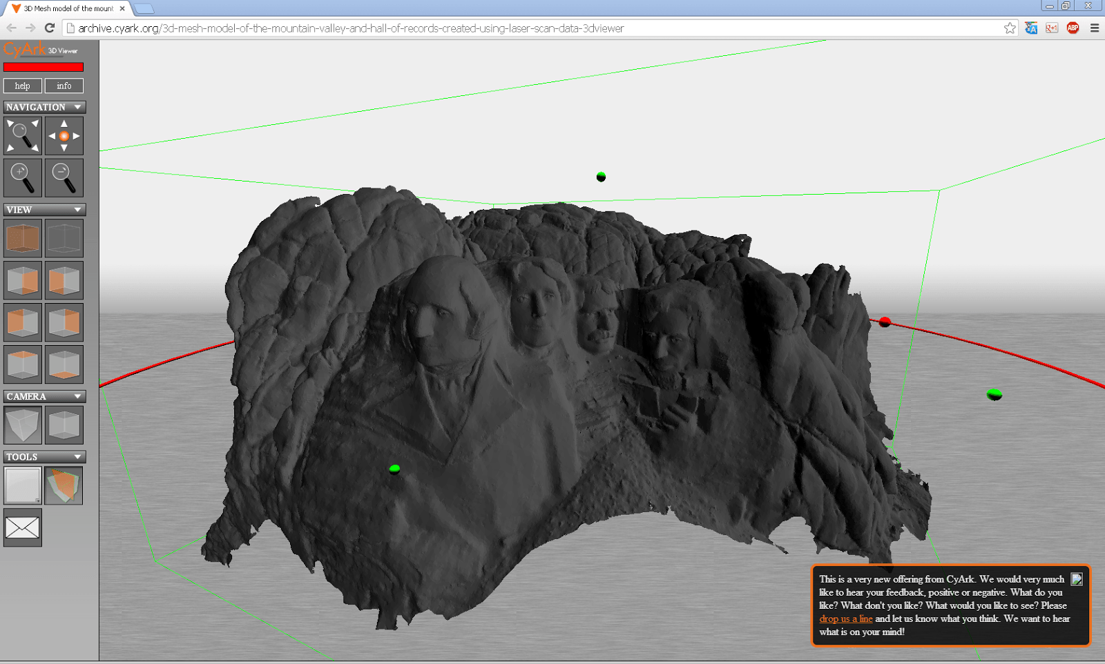 Auf der tollen Webseite von CyArk haben wir ein 3D-Modell des Mount Rushmore gefunden, wonach wir schon längere Zeit gesucht hatten. CyArk wurde 2003 gegründet, um Stätten des Weltkulturerbes kommenden Generationen zu erhalten, und um sie Allen zugänglich zu machen. CyArk ist eine internationale non profit Organisation, welche mit modernen Technologien eine 3D-Bibliothek der Kulturgüter erstellt, bevor sie verloren gehen. Eine gute Sache!