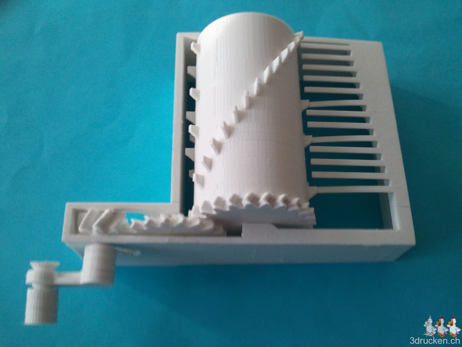 Wir sind bei Thingiverse auf die Parametric Music Box gestossen, und haben sie auf unserem Ultimaker mit 0.08 mm Schichten in 13 h 06 min gedruckt. Bis jetzt haben wir nur den Test Song Zylinder gedruckt, man kann aber die Box mit dem Customizer nach seinen Vorstellungen anpassen.