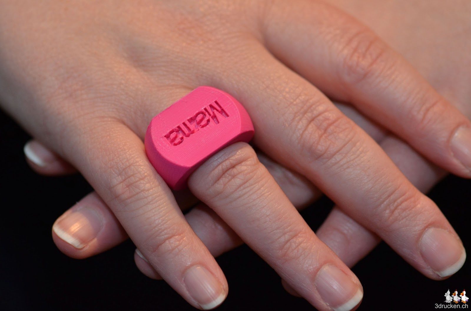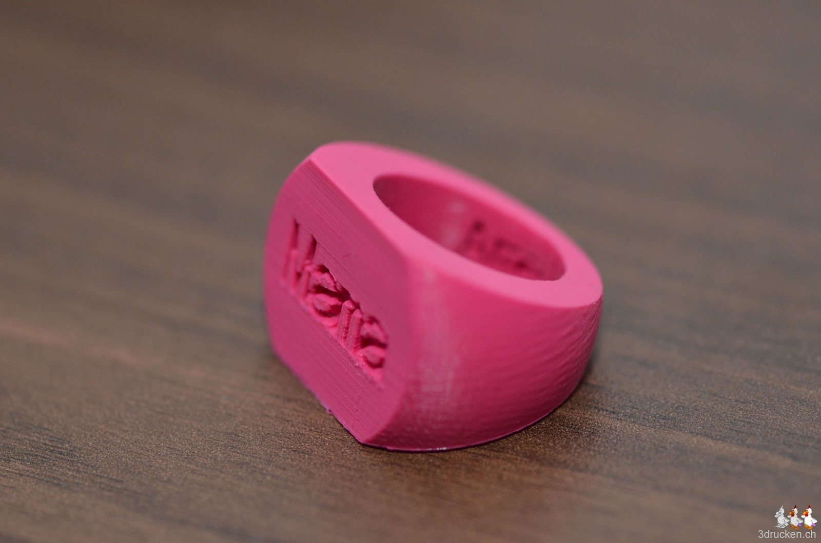 Amélie hat heute für ihre Mama einen Ring gedruckt. Dazu mit dem Customizer auf Thingiverse den Customizable Inscription Ring angepasst und anschliessend in Cura mit 0.08 mm Schichten und verdoppelten Aussenloops geslicet. Nach einigen Druckversuchen mit zu kleinem Durchmesser, passte der Ring dann an Mamas Finger.