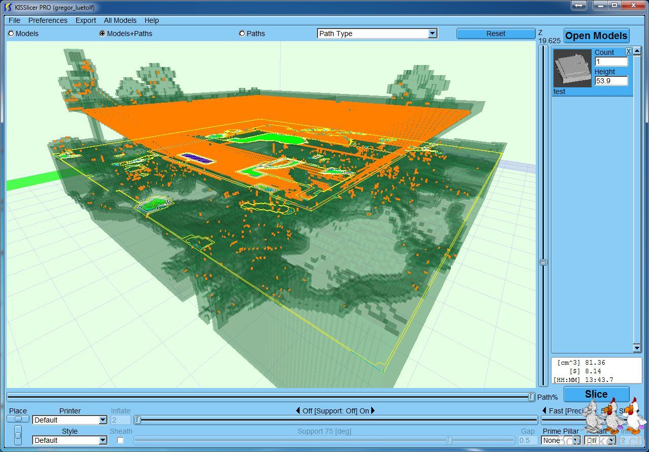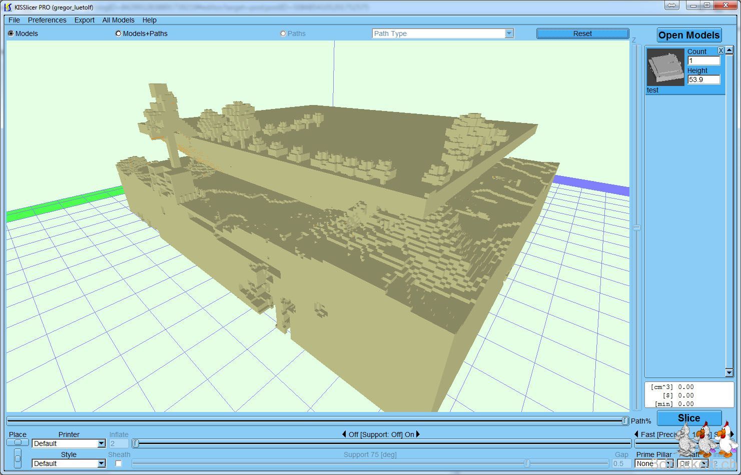 Unser Export wird ganze 190 MB gross im STL ASCII-Format, hier die Darstellung des Modells in KISSlicer. Viel Sinn, das Amphitheater so zu Drucken, macht es ohne Bearbeitung wohl nicht, da müssten wir die Export-Parameter anpassen. Besonders schade ist auch, dass das Glasdach nicht transparent gedruckt werden kann. Eine Lösung wäre, die Glasbausteine komplett zu entfernen, damit man ins Stadion hineinsieht.