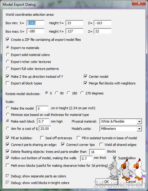 Was lediglich als Test der Eignung von Minecraft für den Unterricht, und Zeitvertreib auf unserem eigenen Minecraft-Server r2d2.ch begann, könnte nun durch das Thema 3D-Drucken und Mineways.com zu einer Anwendung kommen. Mineways erlaubt es, Minecraft-Welt anzuzeigen, und Ausschnitte daraus in verschiedenen Formaten zu exportieren. So können Objekte oder Landschaften aus Minecraft-Welten gerendert, oder 3D-gedruckt werden.