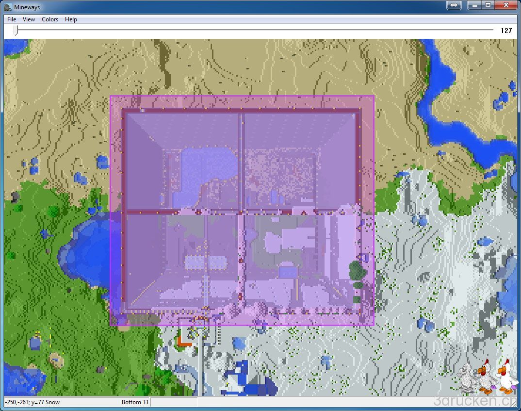 In Mineways kann die Höhe eingestellt, und hineingezoomt werden. Danach mit der rechten Maustaste das Gebiet für den Export markieren.