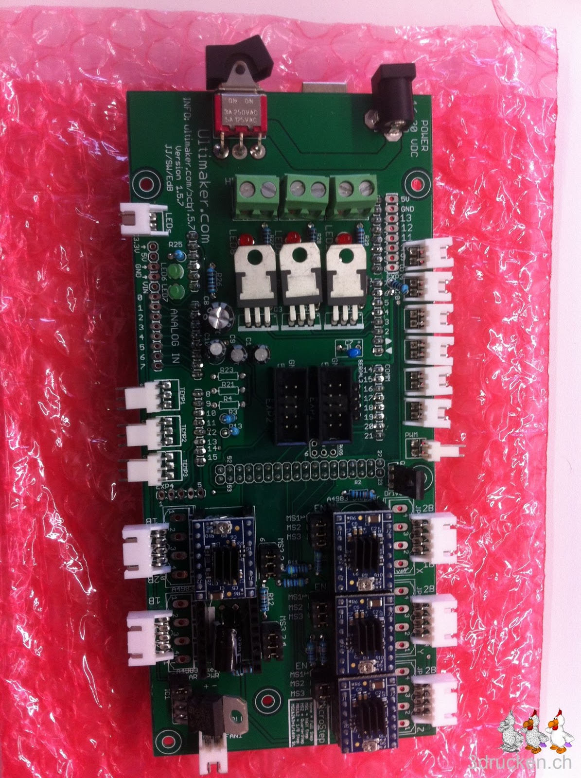 Heute kam die lang ersehnte Elektronik geliefert von Ultimaker. Wir montierten die Alte ab und die Neue dran. Danach luden wir die benötigte Firmware und spielten einen Teil vom First Run Wizard durch.
