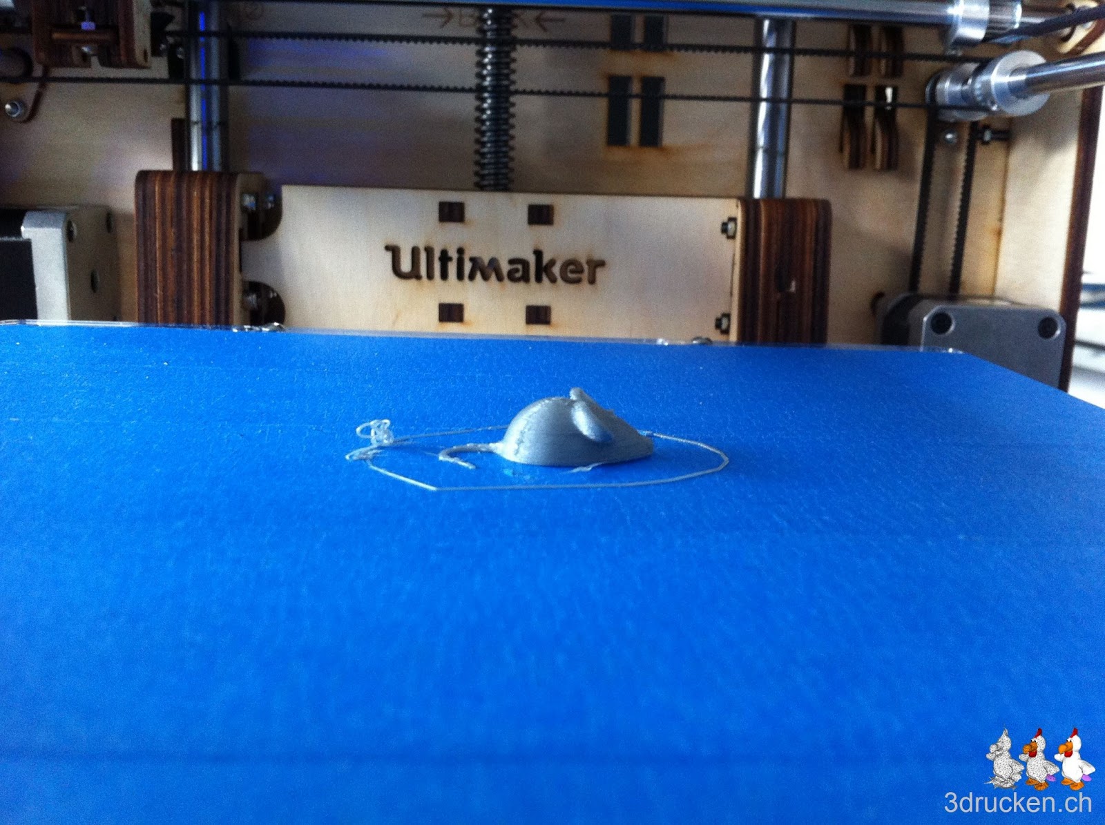 Trotz vielen Widerwärtigkeiten gelang es uns den neuen Ultimaker Heute in Betrieb zu nehmen. Ein unpassendes Teil und einige Fehler beim Zusammenbau rangen uns fast den ganzen Tag ab. Doch kurz nach 17.30 Uhr war es soweit: Der Ultimaker druckte die erste Maus.