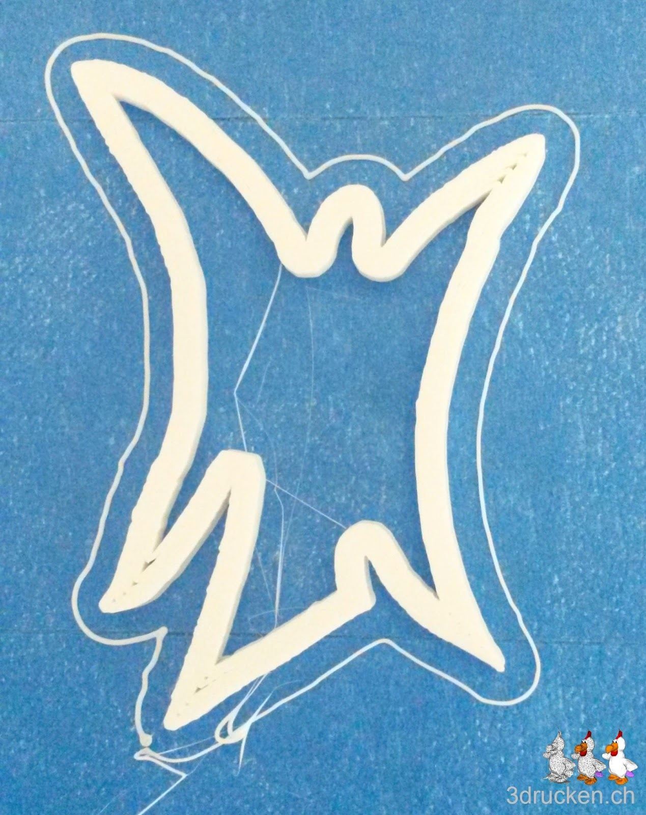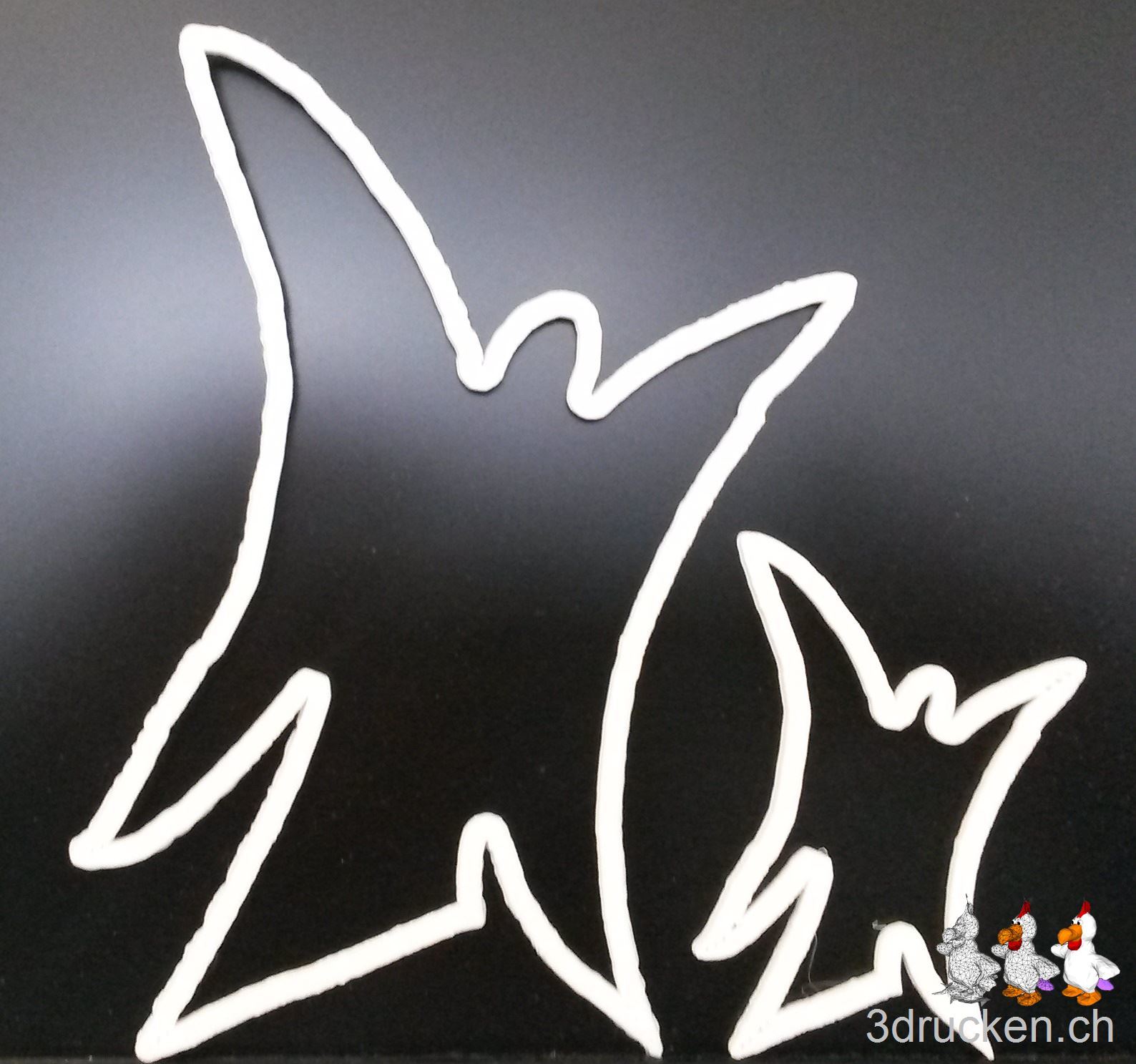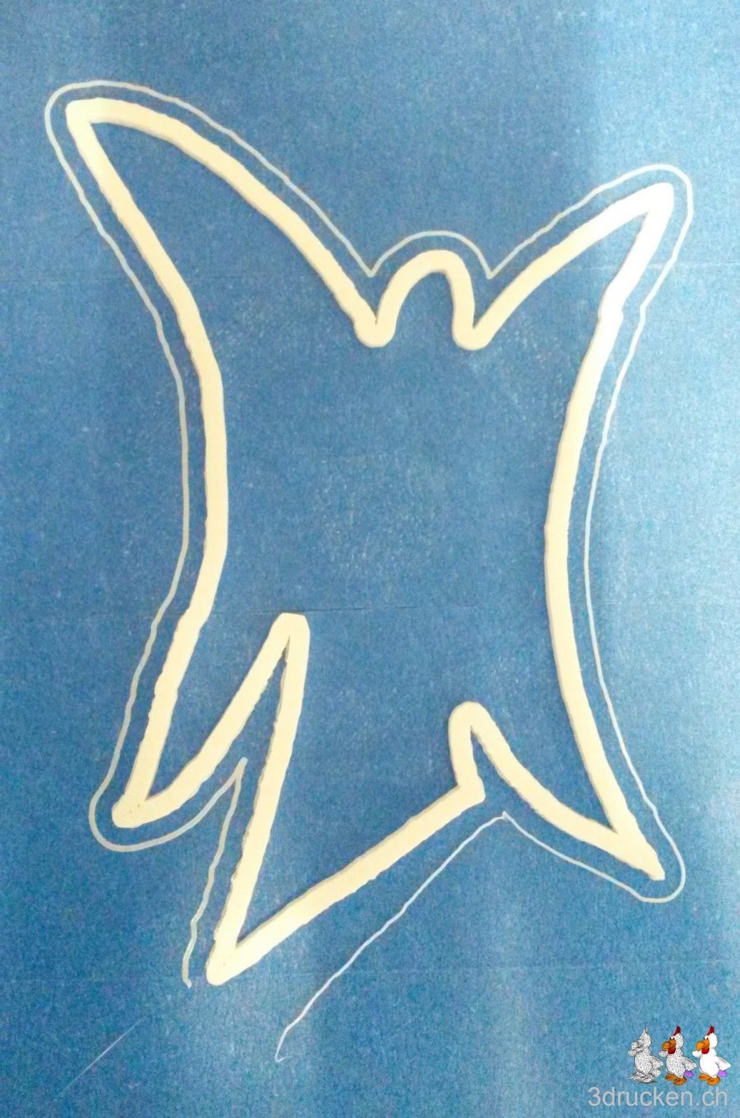 Die Vorarbeit, um ein druckbares Modell zu erhalten, war dieses Mal etwas umfangreicher. Zunächst suchten wir nach einer geeigneten Vorlage. Ein künstlerisch-stilvoller Engel war schnell gefunden. Allerdings war es nicht ganz so einfach, daraus ein schwarz-weiss Negativ herzustellen. Also erfolgte zunächst etwas Handarbeit. Wir haben die Vorlage ausgedruckt und dann ganz analog mit schwarzem Filzstift die Konturen vervollständigt und nachgezeichnet. Nun haben wir den Engel im Photoshop geschwärzt und die png-Grafik schliesslich mit Hilfe des online-Tools Image.Online-Convert in eine Vektorgrafik im svg-Format umgewandelt.So konnten wir nun die Datei in Tinkercad laden und noch letzte Anpassungen anbringen.Nun konnten wir die Datei im als stl-File herunterladen und in Cura zum Drucken vorbereiten.Da wir ja ein vollständiges schwarz-weiss Negativ als Vorlage hatten, mussten wir in Cura – wie schon beim Elch – die Einstellungen so wählen, dass nur der eigentliche Rahmen des Objekts gedruckt wurde. Mit Schichten von 0,09mm und einem Shell von 2,7mm wählten wir eine Bottom/Top-Dicke von 0mm und eine 0%ige Füllung.So druckten wir zunächst einmal einen doch relativ grossen Engel. Trotz seiner Grösse dauerte der Druck nur 26min.