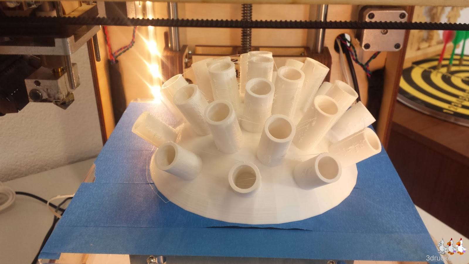 Der Durchmesser der Röhren ist zu klein, und so lassen sich die Edelsteine nicht reinstecken. Mit dem Messschieber nachgemessen, haben die Röhren einen inneren Durchmesser von zwischen 14.2 und 14.6 mm. Die Hälse der Edelsteine sind aber zwischen 15 und 15.2 mm dick. Schauen wir in Tinkercad nach, haben wir alle Röhren mit 15 mm Innendurchmesser konstruiert. Durch den Verzug des Materials bei den verwendeten 225° C ergibt sich aber wohl eine Abweichung von 5-10 %. Wir rechnen also mit 15.2 mm + 10 % = 16.7 mm und runden noch auf, dann kommen wir auf 17 mm.