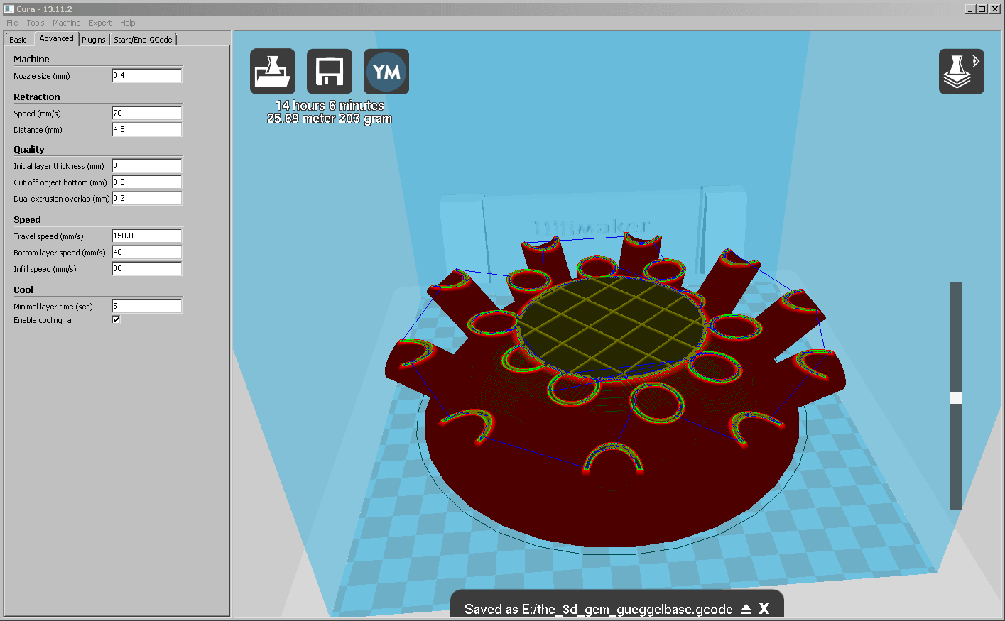 Wir haben durch eine höhere Geschwindigkeit der ersten Schicht von 40 mm/s und der Füllung von 80 mm/s beim Slicen versucht, Zeit beim Druck zu sparen. Durch die Grundfläche lässt sich dies wohl gut umsetzen, ohne dass die Qualität zu sehr darunter leidet. Als nächstes ein paar Stunden warten und dann morgen sehen, ob die Edelsteine in das neue Basisstück passen.