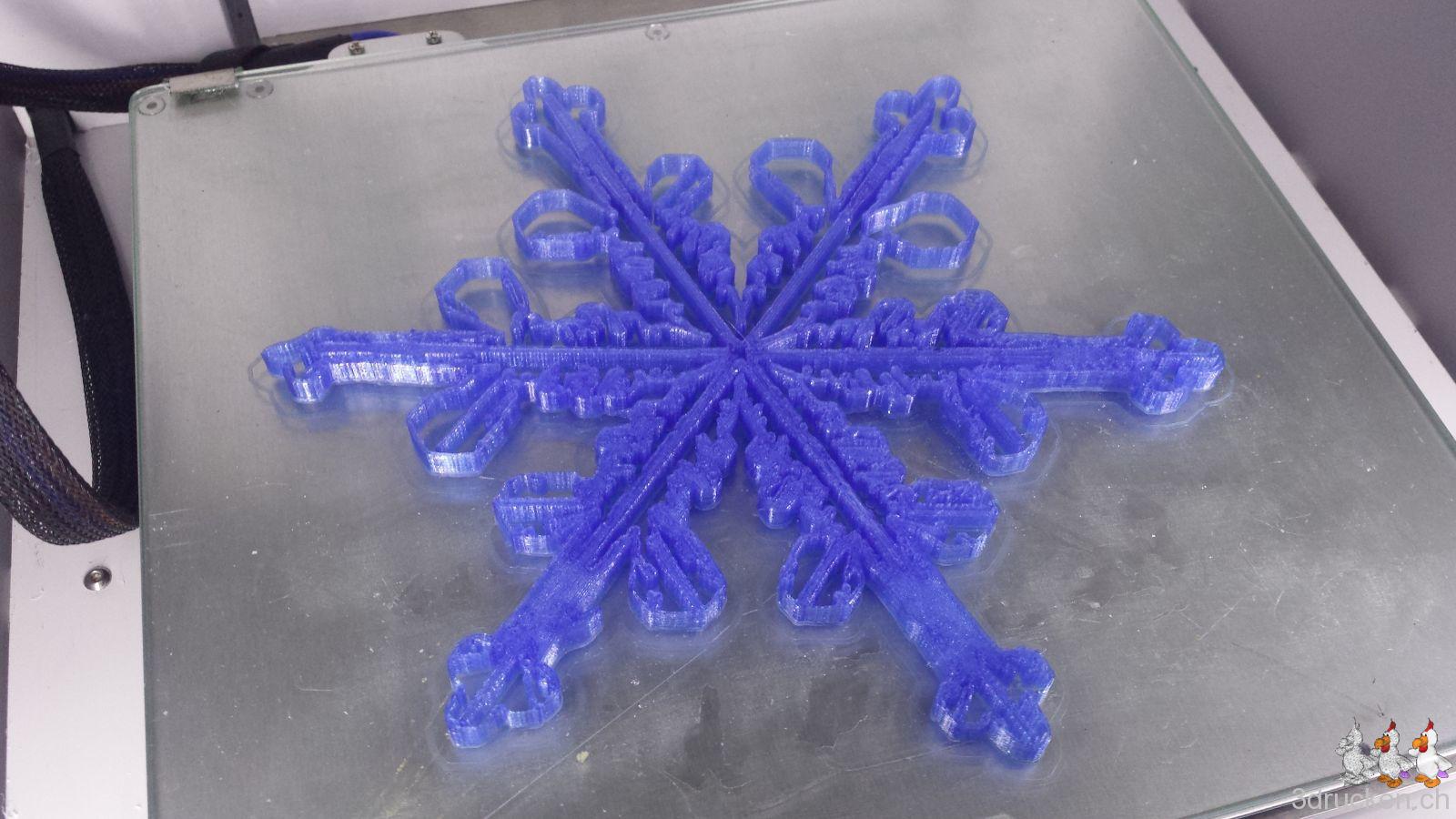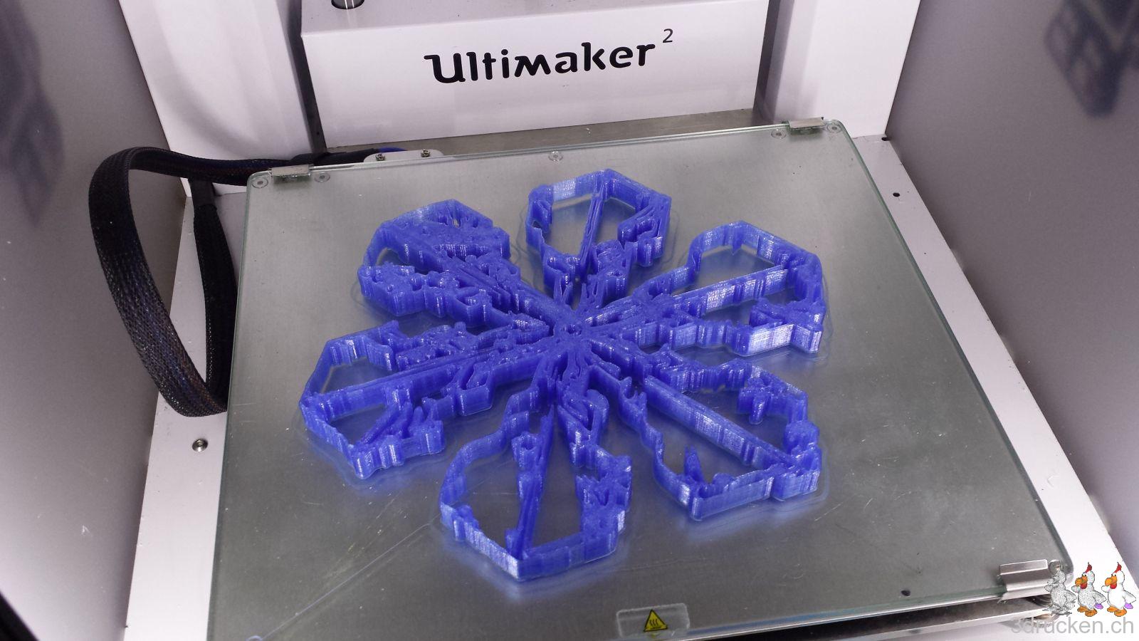 Ausgedruckt haben wir die überarbeiteten Neuschneekristalle auf einem Ultimaker 2 aus blau transparentem PLA in 0.2 mm Schichten. Die so erstellten Objekte lassen sich zudem besser aufhängen und sie wirken nicht so wuchtig sondern eher elegant und filligran wie Schneekristalle auch sind. Ihr findet diese Version der Neuschneekristalle ebenfalls in unserem Design Fresh snow crystals auf Thingiverse.