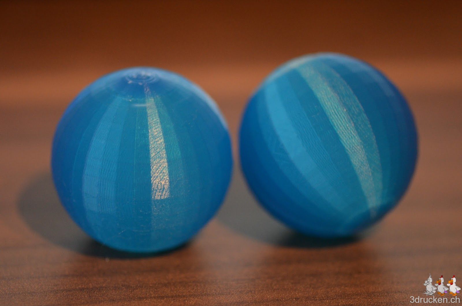 Veränderte Slicing-Parameter bei der Kugel rechts: Wandstärke 0.8 mm, Deckschichten 0.6 mm. Sieht besser aus, hat aber bei 0.08 mm Schichten genau so lange gedauert wie die erste Kugel.