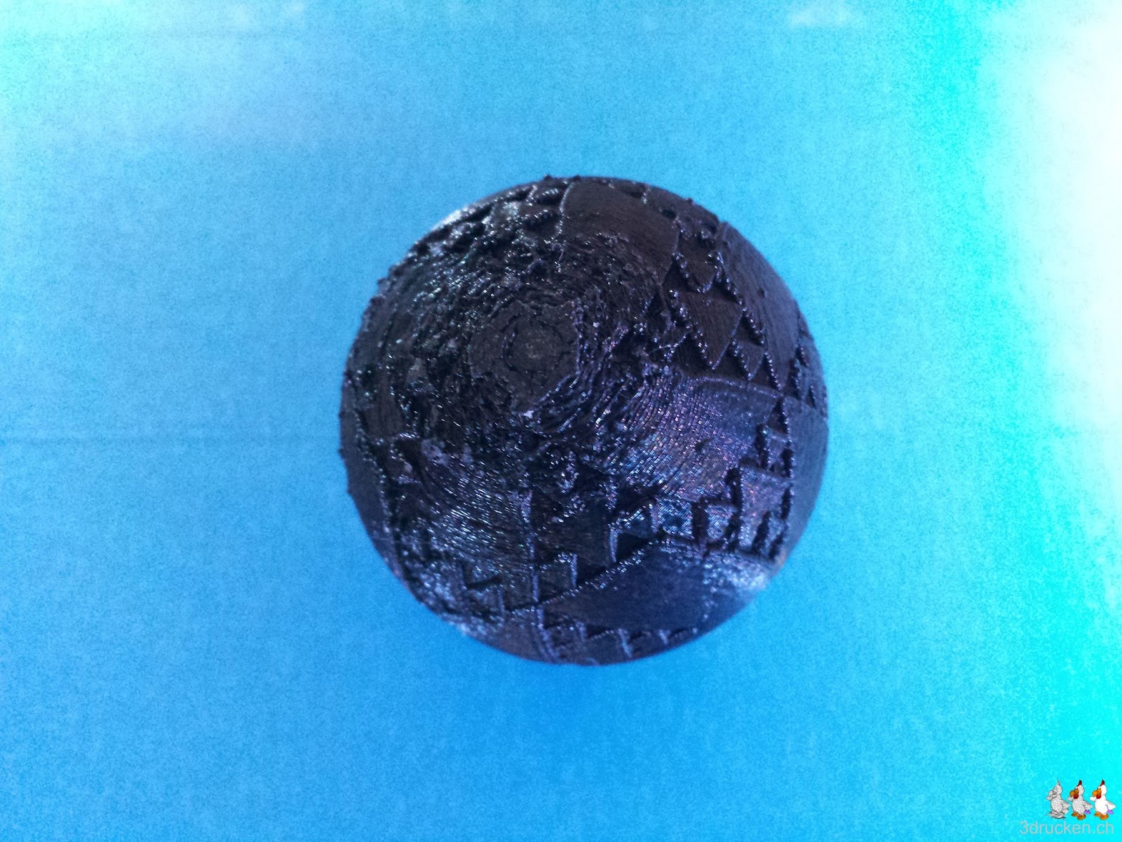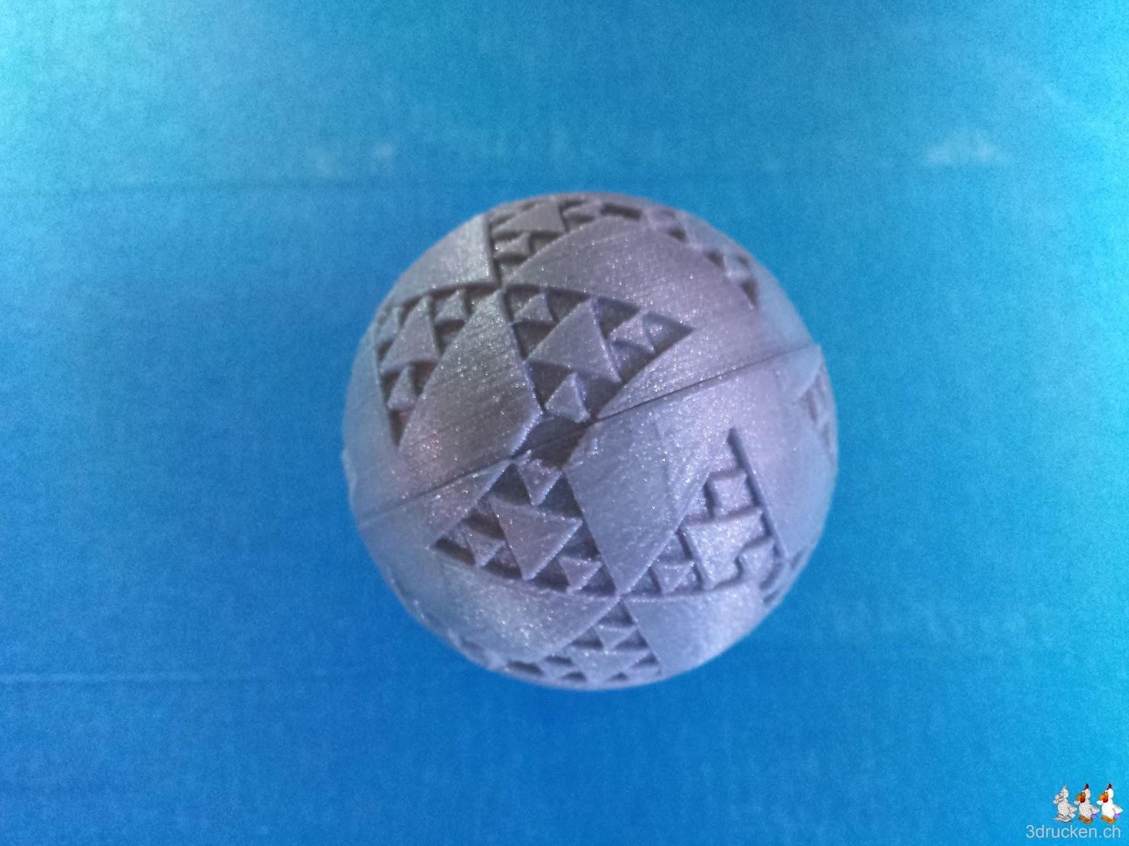 Hinter diesem spektakulären Namen steckt ein relativ simples Objekt, nämlich eine hohle Kugel mit einem Dreiecksmuster darauf. Da die Kugel ganz unten stark überhängend ist blieb uns nichts anderes übrig als sie mit Support zu drucken. Obwohl die Kugel innen komplett hohl ist, druckte der Drucker den Abschluss sehr schön. Sorgen machte uns jedoch das untere Ende der Kugel, den dies sieht bei den drei ersten versuchen schlecht aus. Zwar konnten wir ein kleine Verbesserung hinbringen aber die war wie gesagt wirklich nur klein.