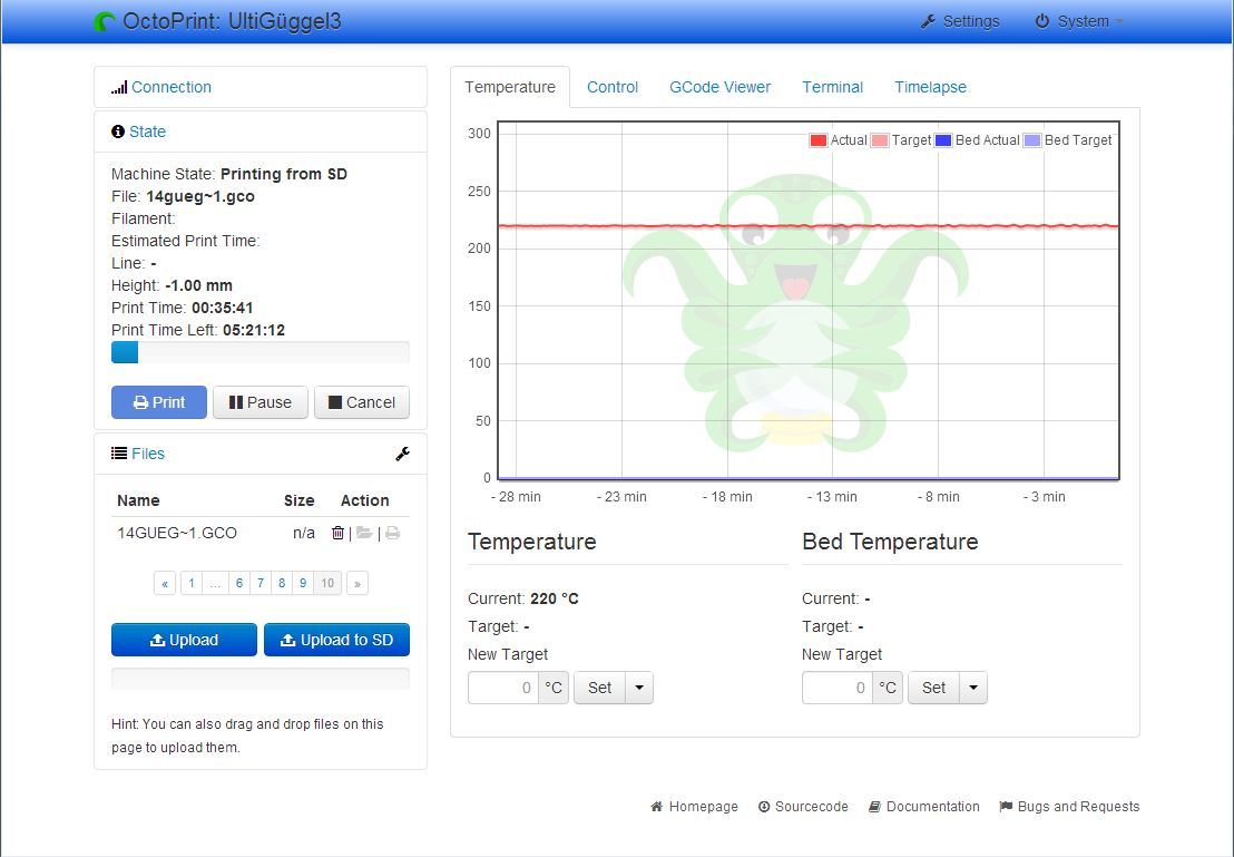 OctoPrint unterstützt nun Drucken von der SD-Karte im Ulticontroller. Es können auch via Web-GUI gcode-Dateien auf die SD-Karte hochgeladen werden. Allerdings dauert dieses „Streaming“ wegen der langsamen Geschwindigkeit der seriellen Schnittstelle ziemlich lange. Am besten lädt man die grösseren gcode-Dateien zuvor am Computer auf die SD-Karte, legt die Karte in den Ulticontroller, und druckt dann via Octoprint. Leider ist es nicht möglich, die Grösse der gcode-Dateien angezeigt zu bekommen, und auch der GCode Viewer funktioniert nicht. Ebenfalls wird keine Zieltemperatur im GUI angezeigt, nur am Ulticontroller sieht man die. Wir haben erst den Ultimaker zuhause damit aufgerüstet, die Geräte im Büro warten noch bis nach der Tagung darauf.