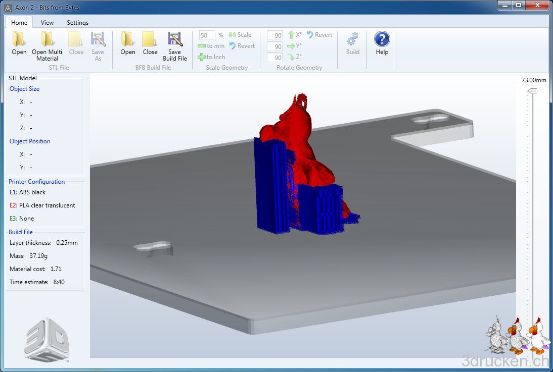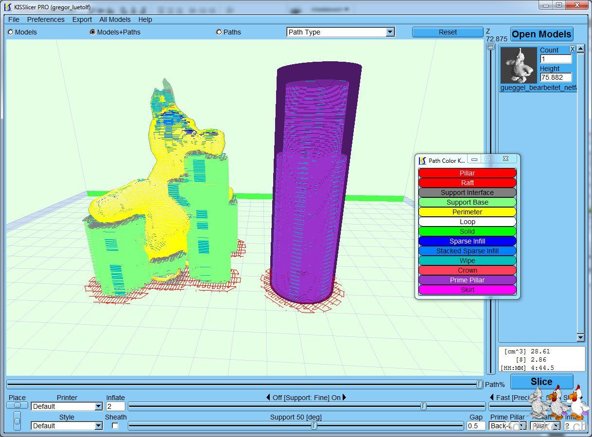 Nun gehts daran, das Modell für die erste, stehende Variante mit KISSlicer und Axon 2 slicen zu lassen. Ich verwende immer erst KISSlicer, weil der viel schneller ist, und danach noch Axon 2 um heraus zu finden, ob die Software was grundlegend anders machen würde.