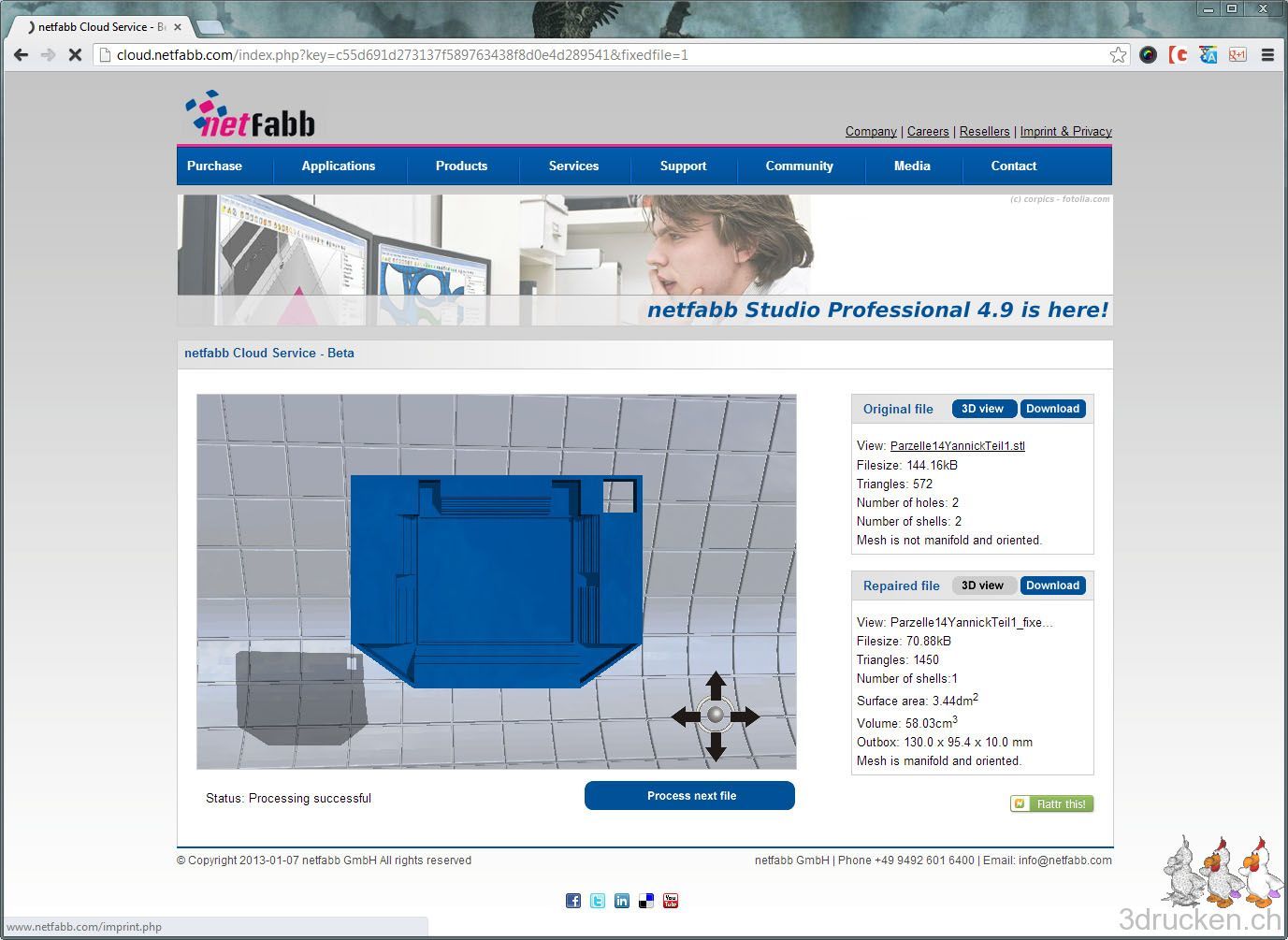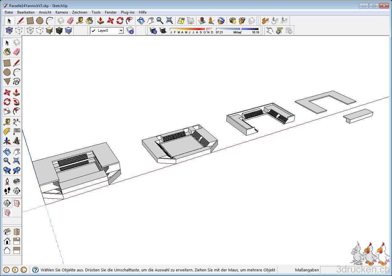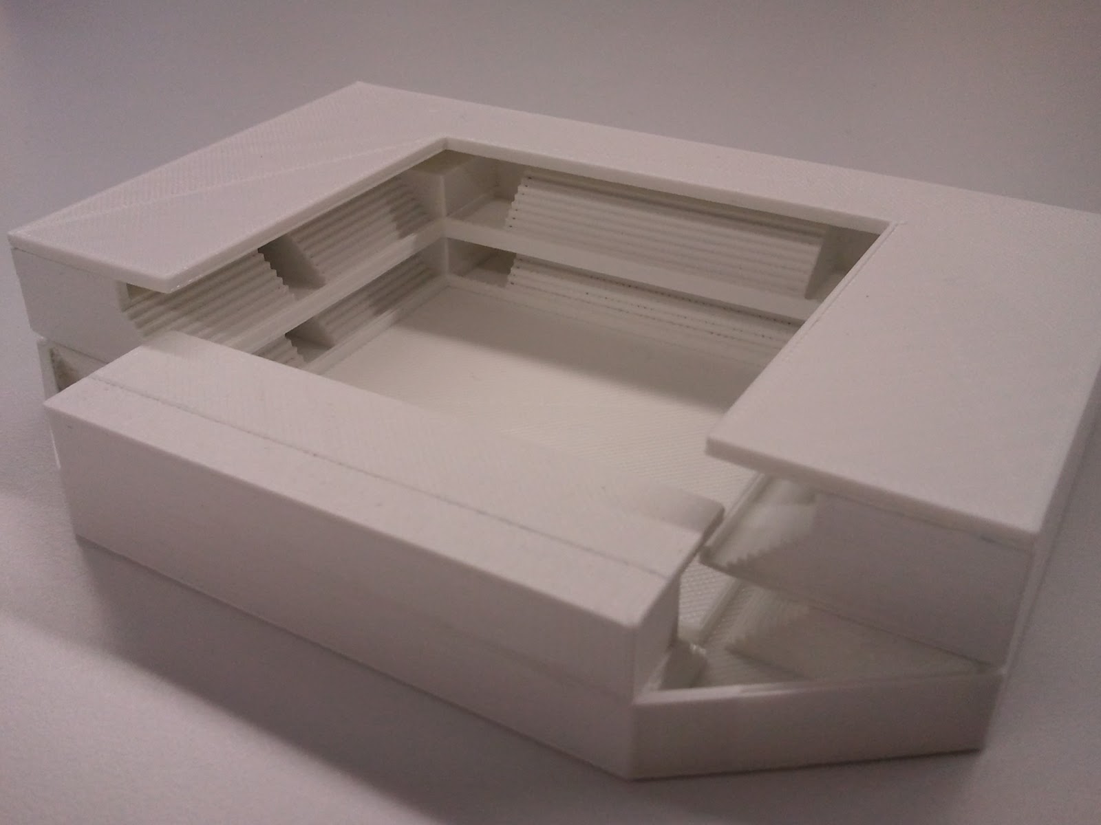 Auch haben wir wieder auf STL als Exportformat aus Sketchup umgestellt, da sich die Modelle so einfach durch den Clouddienst von Netfabb korrigieren lassen. In unserem Fall enthielt die unterste Stufe des Stadions mehrere Fehler im Mesh, welche durch das Hochladen bei cloud.netfabb.com automatisch behoben werden konnten.