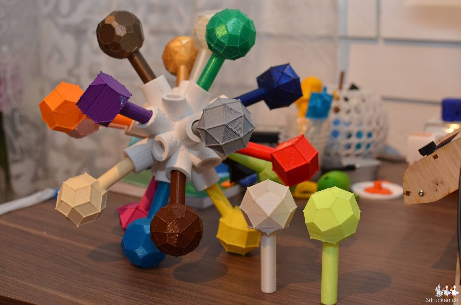 24 unregelmässige Fünfecke bilden das Pentagonikositetraeder, gedruckt in 6 h 52 min. Leider können wir die beiden zuletzt gedruckten Catalanischen Körper noch nicht am Zentrumsstück einstecken, da wir erst die 8 letzten Löcher ausbohren müssen. Inzwischen Drucken wir noch die fehlenden sechs Körper.