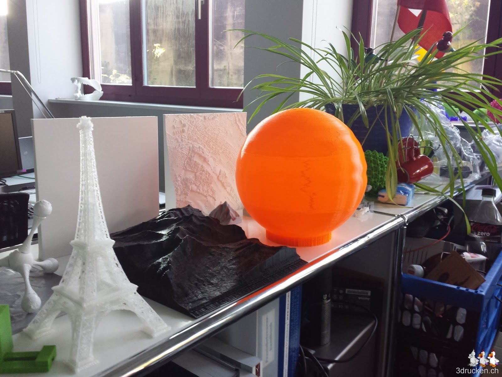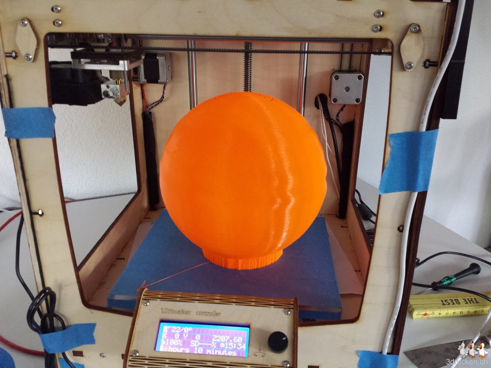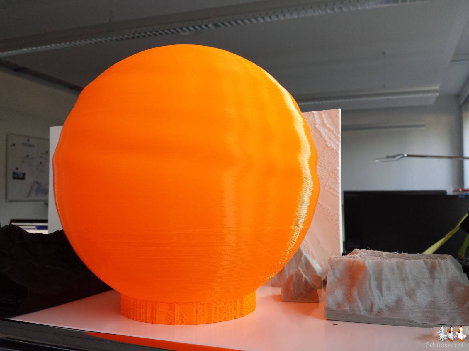Die grosse hohle Sphäre von Peter Parnes hat uns dazu animiert, unser neues Druckmaterial leucht-orange, fluoreszierendes PLA von Swiss RepRap auszuprobieren. Wir haben ähnliche Effekte beobachtet wie Peter bei seinem Druck. Das Material oben wird etwas zu schwer, was die Sphäre leicht einfallen lässt. Das Supportmaterial unten an der Sphäre lassen wir gleich stehen, dann können wir sie gut hinstellen. Eine Lampe müssen wir drin nicht montieren, das Material leuchtet so schön, zumindest wenn es etwas Licht hat.