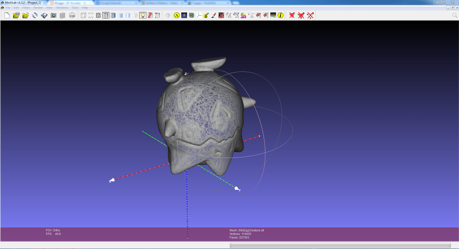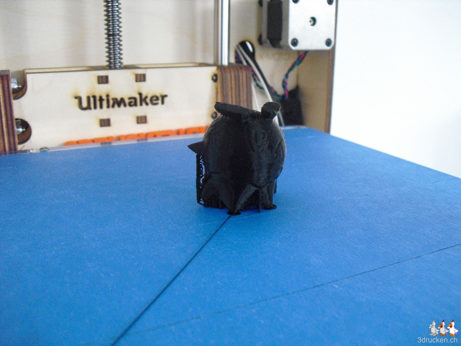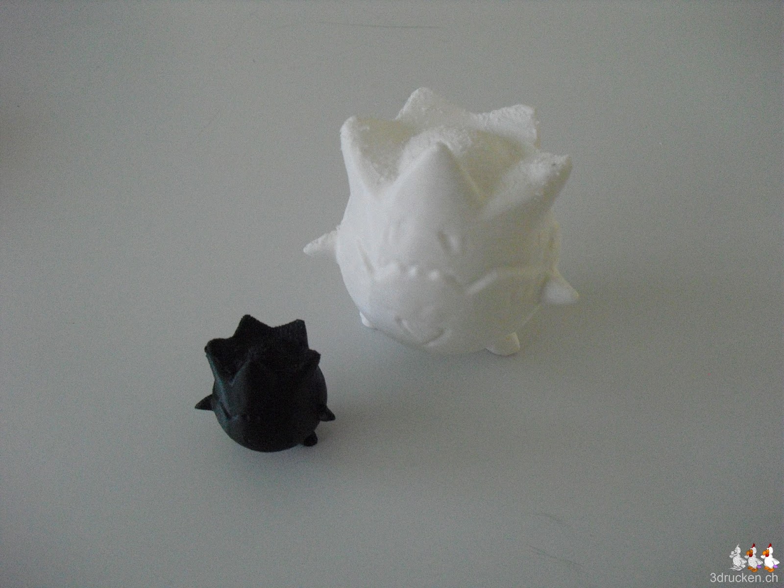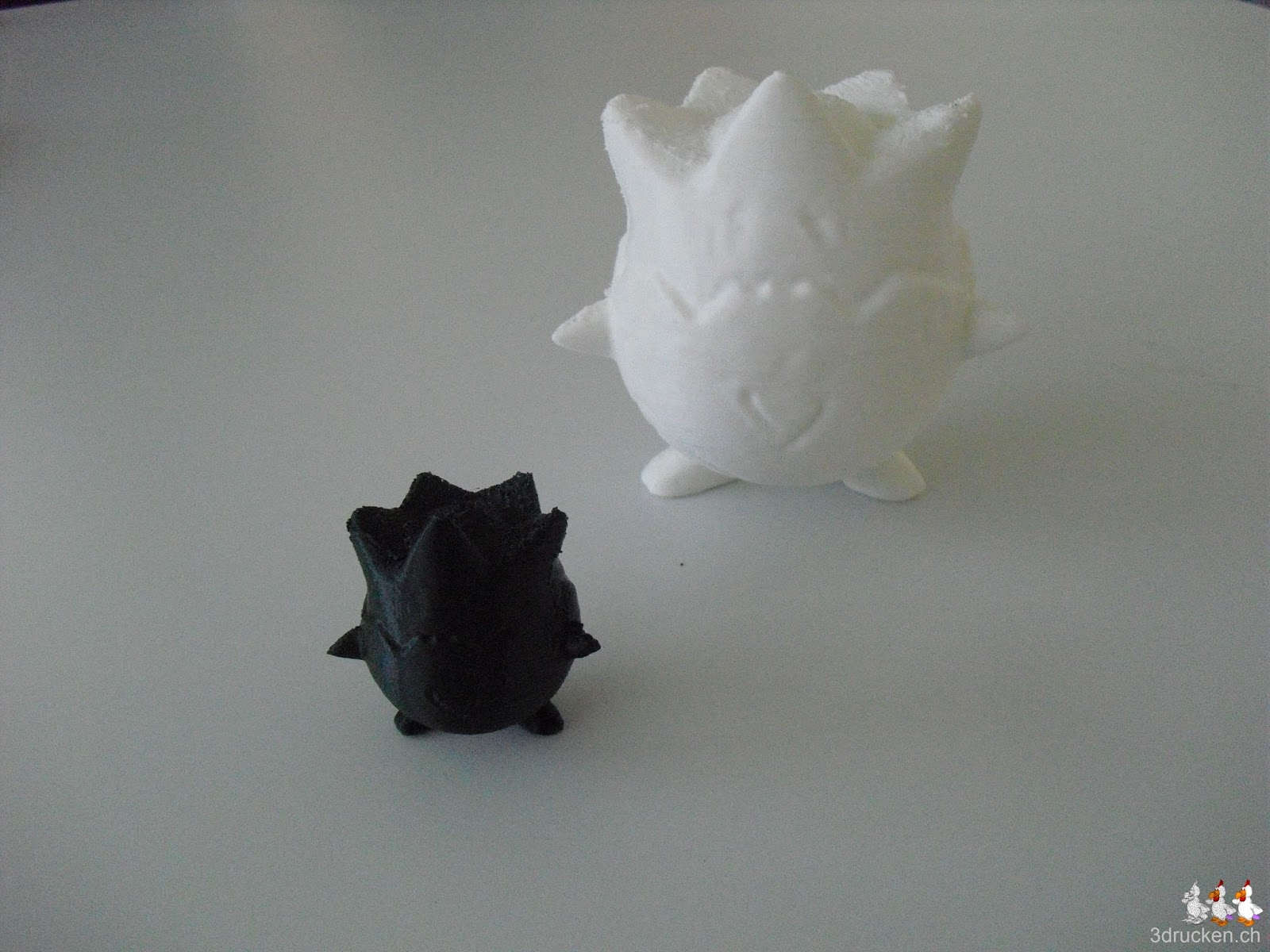 Wir wollten heute das Pokémon Togepi ausdrucken. Unsere erste Idee war, es auf dem Kopf auszudrucken, dazu haben wir es wie auch schon mit MeshLab auf den Kopf gedreht. Weiter haben wir es erst mal etwas kleiner mit schwarzem PLA ausgedruckt, um das Ergebnis zu sehen. Es war zwar recht mühsam den Support auf dem Kopf zu entfernen, trotzdem waren wir damit zufrieden. Also druckten wir dasselbe doppelt so gross mit weissem PLA. Bei diesem Druck gab es wegen dem Support kleine Hügel auf der Seite und der Support selber war noch schwerer zu entfernen. Deshalb kam uns nun die Idee Togepi in zwei Teilen zu drucken. Aber darüber später mehr…