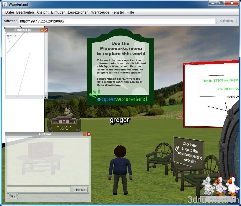 Würde sowas wohl bieten, ist aber komplett in Java. Zudem müssten wir unseren eigenen Open Wonderland Server aufsetzen, und wie in den FAQ steht, werden diverse Ports für die Kommunikation zwischen Server und Java-Clients benötigt. Dafür wäre diese Variante gleich auch noch 3D begehbar.