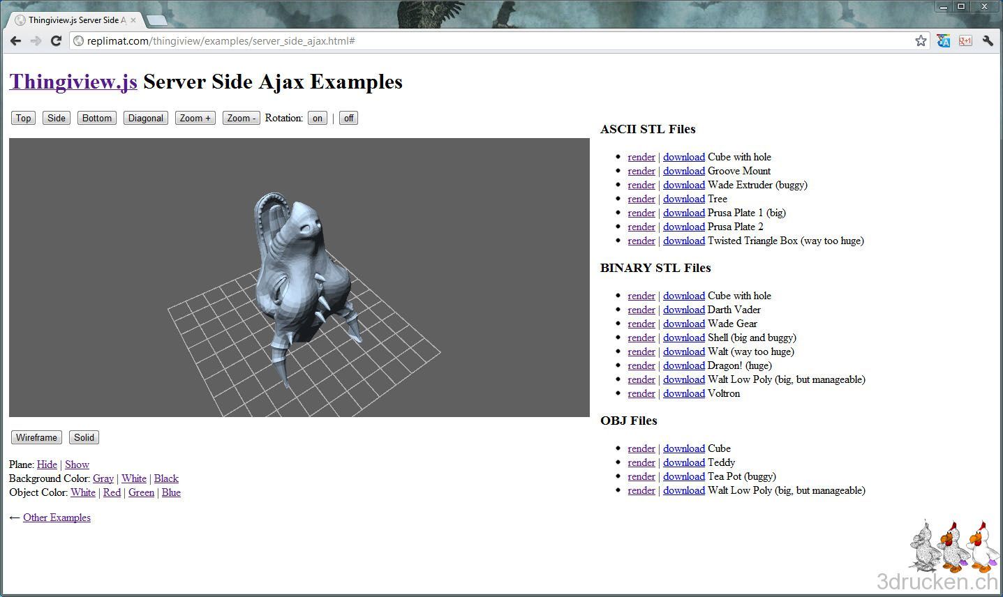 Eine JavaScript-Library welche STL und OBJ parsen und darstellen kann. Wäre auch eine Möglichkeit, wenn wir das selber bauen möchten, was wohl allerdings zu aufwändig ist.