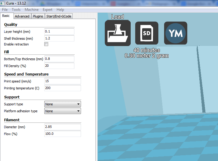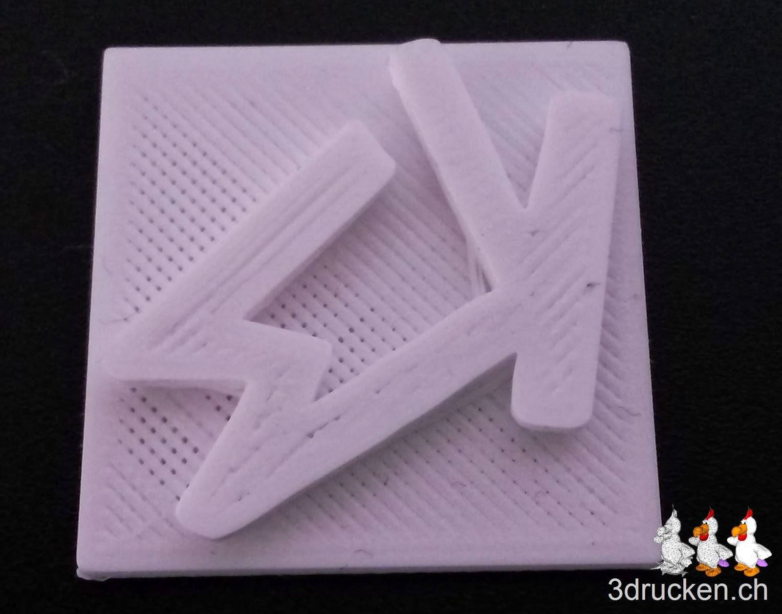 Für den zweiten Testdruck verwendeten wir bereits das Soft-PLA. Bei 10mm/sec Druckgeschwindigkeit und 210° klappte der Druck gut, allerdings merkten wir, dass die Bottom/Top-Dicke von 0,5mm etwas zu knapp war. Also druckten wir ein drittes Exemplar mit den folgenden Einstellungen: