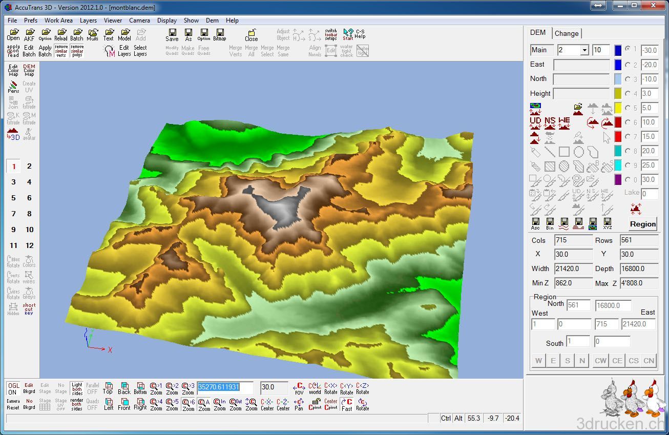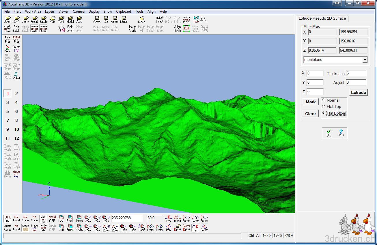 - Das exportierte montblanc.dem in AccuTrans 3D als USGS 1-degree ASCII DEM laden.