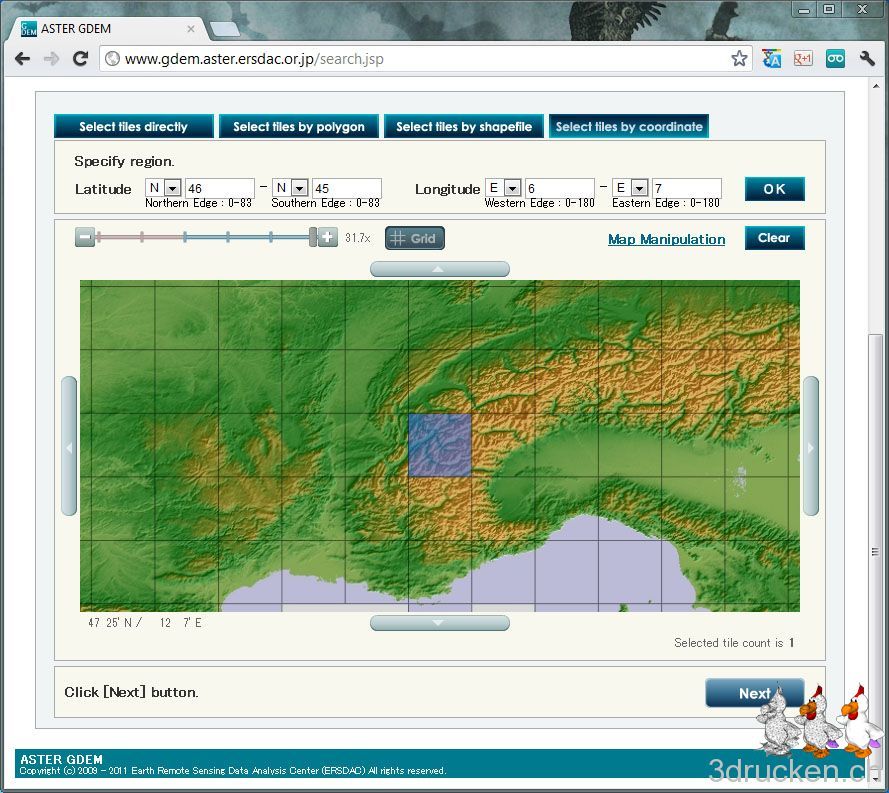 - Herunterladen der benötigten ASTER GDEM-Daten
