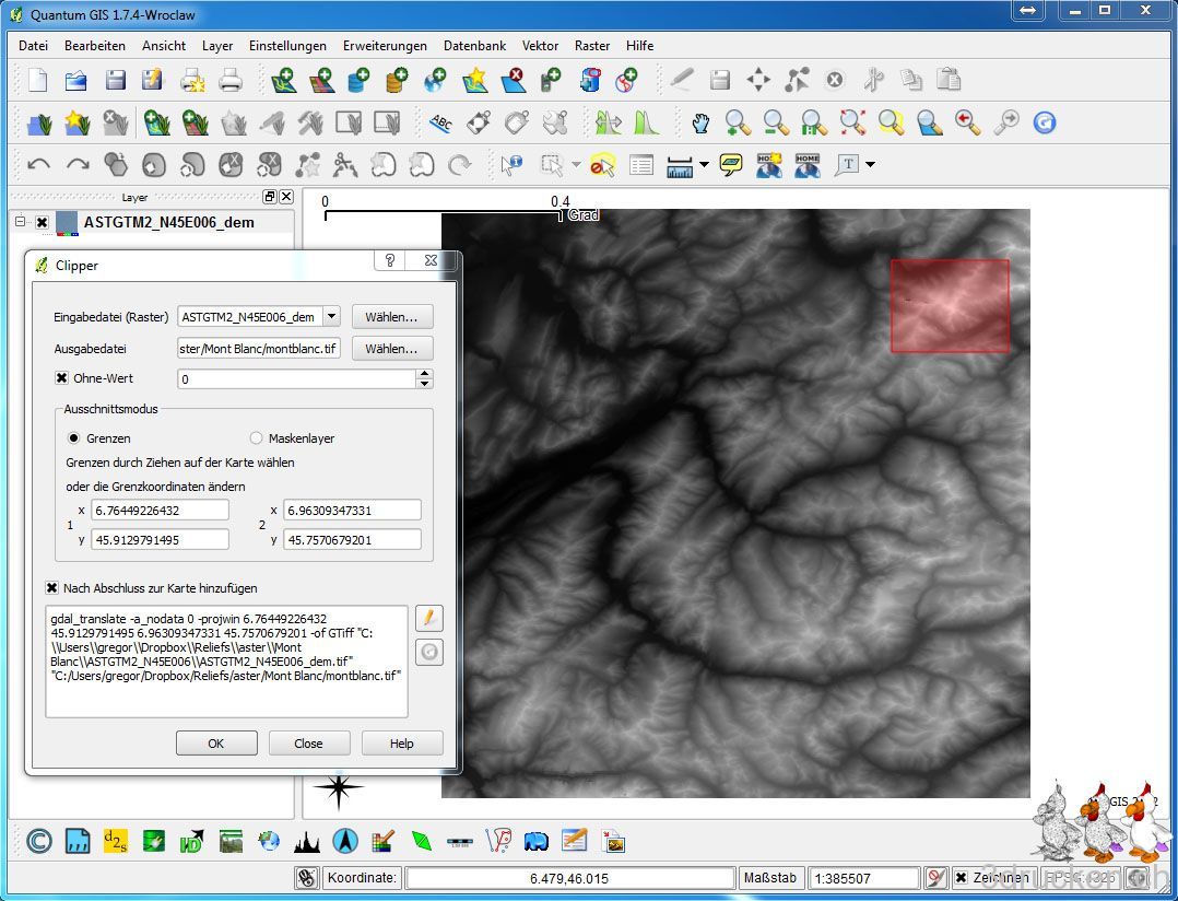 - Geeigneten Ausschnitt wählen. Das heruntergeladene GeoTIFF „ASTGTM2_N45E006_dem.tif“ in QGIS öffnen und mit [Raster].[Extraktion].[Clipper] auf die Koordinaten aus Google Maps (x1/y1: links oben ; x2/y2: rechts unten) schneiden und als GeoTIFF ausgeben lassen. Alternativ kann man das gewünschte Gebiet auch von Hand auf dem Bild markieren und nach Belieben anpassen.