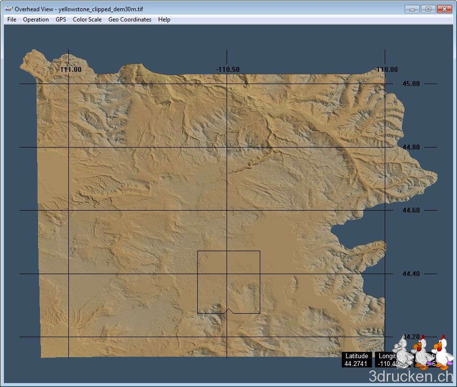 Ziel ist ein Relief des Yellowstone Nationalparks, welches auf unserem 3D-Drucker ausgedruckt, und anschliessend dem Grossen Napa übergeben werden kann.