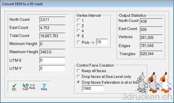 In AccuTrans 3D haben wir die Daten aus dem USGS ASCII DEM mit [Dem].[Convert to 3D (less water)] in ein 3D-Modell umgewandelt. Dabei die Einstellung „Control Face Creation“ beachten, damit nur die Fläche verwendet wird, welche auch wirklich der Grenze entspricht, und die nodata-Bereiche abgeschnitten werden.