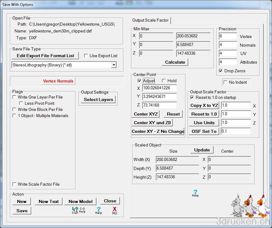 Danach Exportieren wir das Modell aus AccuTrans 3D als STL (Stereo Lithographie (Binary)) mittels Save With Options…. Mit welchen Dimensionen und Zentrum das Modell schlussendlich gespeichert wird, sieht man unten rechts im Bereich Scaled Object. Damit da beim Zentrum 0,0,0 steht, drücken wir unter Center Point nochmals den Knopf Center XYZ und beachten, dass Adjust angewählt ist. Nun sollte unten die Grösse und das Zentrum des Modells stimmen. Falls nicht automatisch aktualisiert wird, kann Update gedrückt werden.