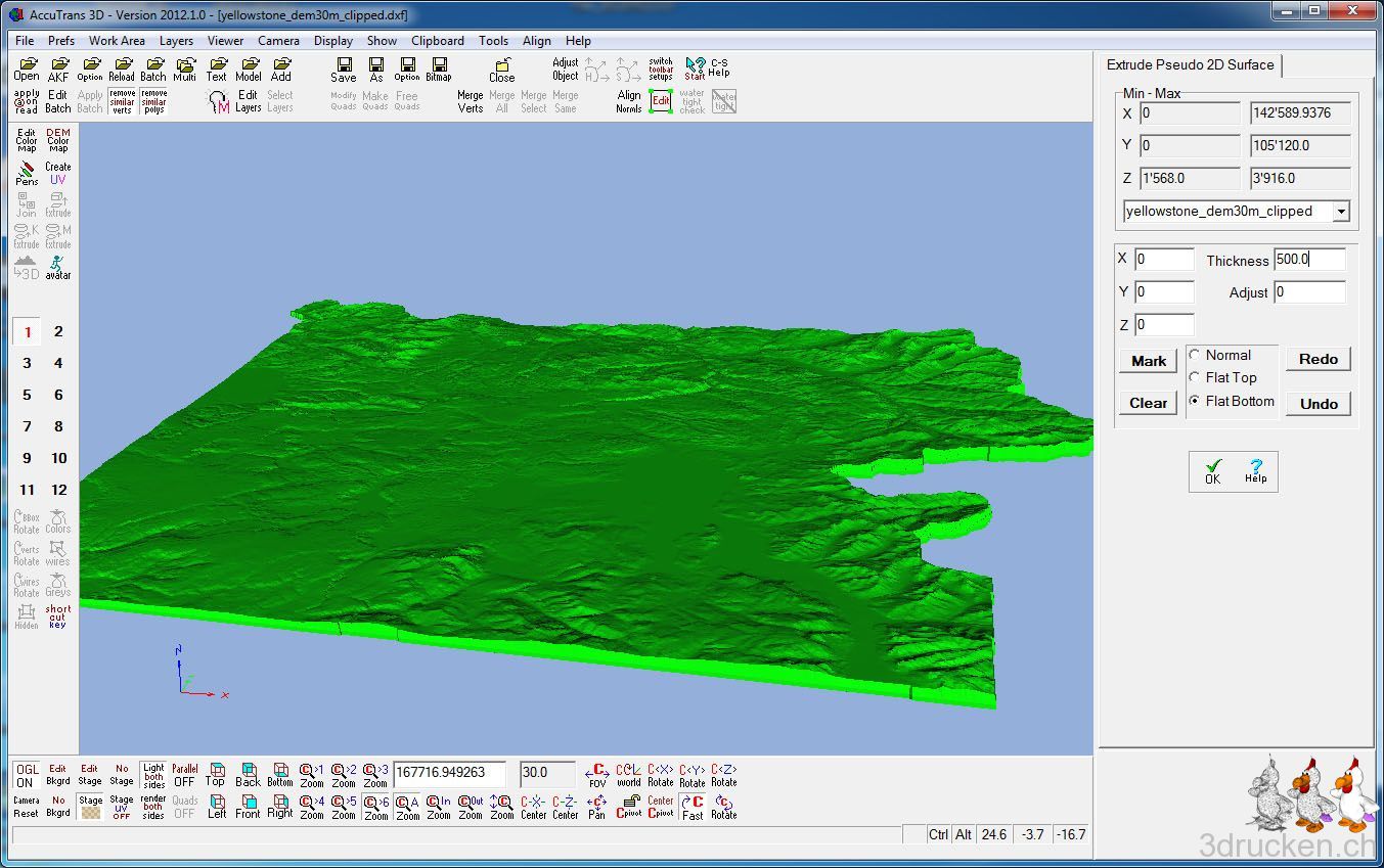 Aus Speichergründen wählen wir den Umweg, diese 3D-Oberfläche nun als DXF abzuspeichern [File].[Save With Options…], und dann das DXF alleine in AccuTrans 3D zu öffnen, um mit der Funktion [Tools].[Extrude Pseudo 2D Surface] ein Relief erstellen zu können.