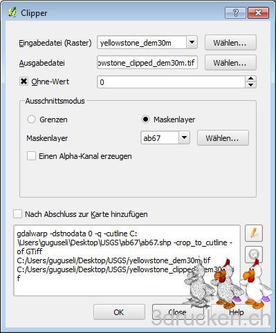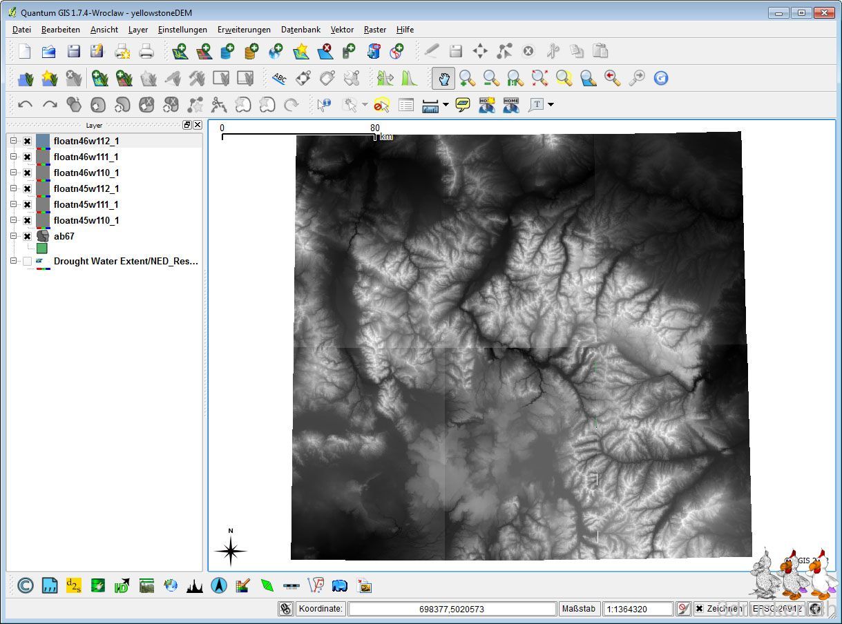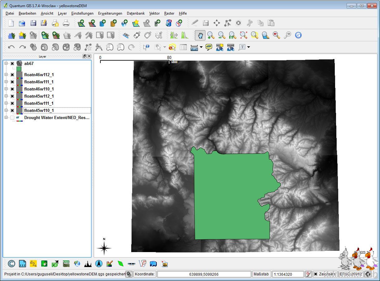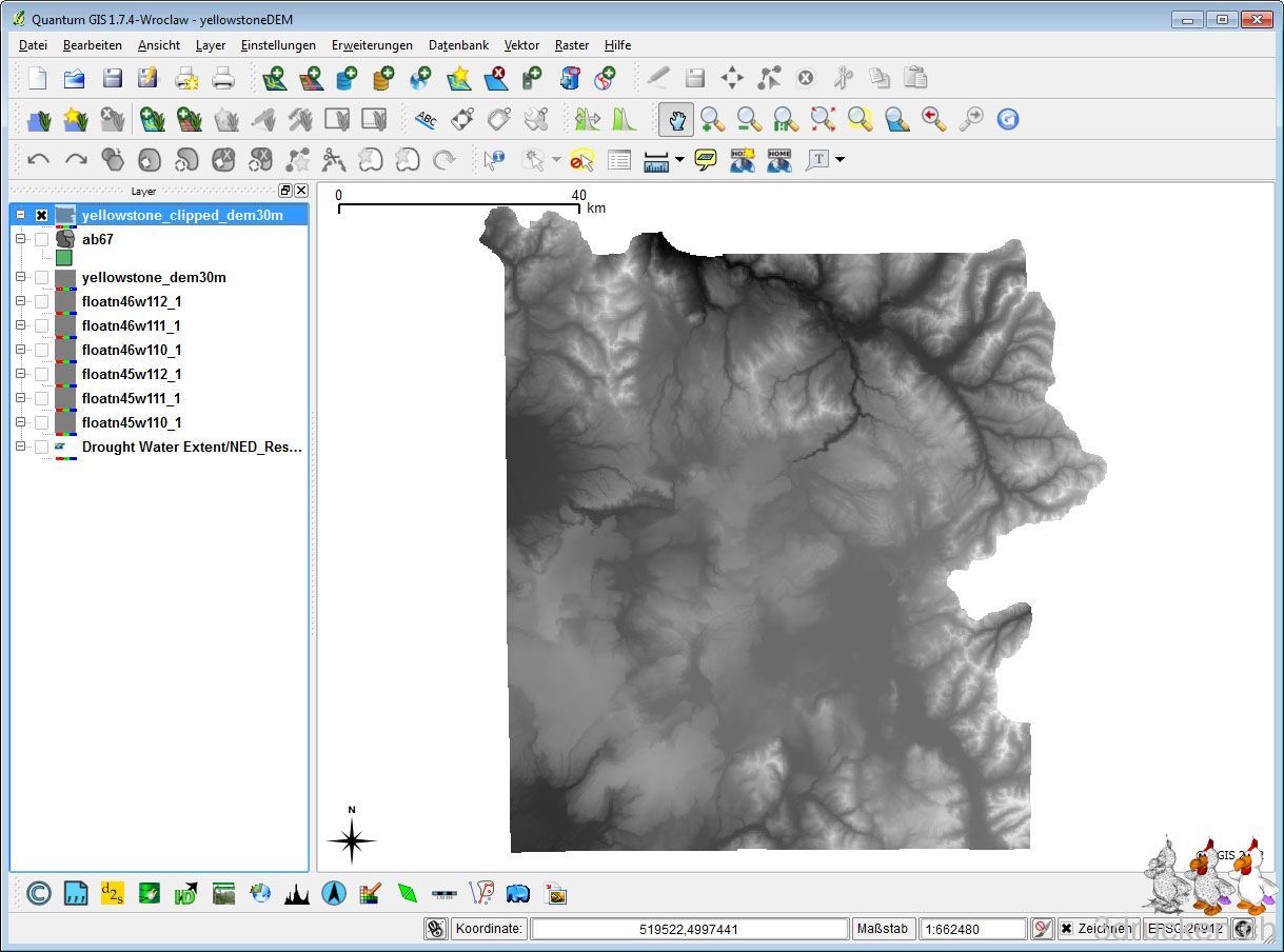 Da wir jetzt ein zusammenhängendes GeoTIFF DEM des gesamten Yellowstone Nationalpark besitzen, können wir dieses mit den Parkgrenzen verschneiden. Am besten geht das in QGIS mittels [Raster].[Extraktion].[Clipper].