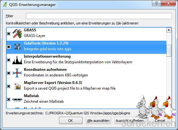 Möchte man diese Daten trotzdem mit QGIS öffnen, benötigt man Informationen zum dabei verwendeten, proprietären „Arc/Info Binary Grid Format“. Diese findet man etwa in der ESRI ArcGIS Hilfe, ESRI Knowledge Base, oder im Post „ESRI rasters in GRASS or QGIS“ aus dem Blog von Ecostudies. Den entscheidenden Hinweis auf das Plugin GdalTools zu QGIS liefern die Quantum GIS (QGIS) Tutorials. Bei uns war das Plugin zwar bereits nach der Installation von QGIS vorhanden, allerdings nicht aktiviert. Dies kann man im Menü von QGIS unter [Erweiterungen].[Erweiterungen verwalten…] tun. Falls das Plugin GdalTools nicht vorhanden ist, kann es gemäss Anleitung in den QGIS Tutorials installiert werden.