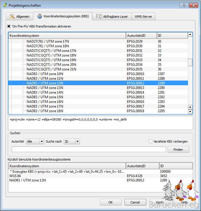 Damit die Parkgrenzen (Shape-Datei, Vektor) danach genau über die DEMs zu liegen kommt, und von den Dimensionen her passt, muss man unbedingt die Einstellungen des Projekts in QGIS setzen. Man macht dies z.B. über das Menü [Einstellungen].[Projekteinstellungen…] Koordinatenbezugssystem (KBS). Dort ist sowohl für das Projekt ein KBS zu wählen, wie auch On-The-Fly-KBS-Transformation aktivieren einzuschalten.