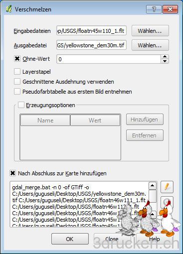 Um die DEMs mit der Parkgrenze verschneiden zu können, müssen sie alle auf einem Layer liegen. Das erreicht man durch vorgängiges Zusammenfügen (gdal_merge) der 6 Teilstücke. Gemacht wird dies, indem man erst die Daten sämtlicher Teilstücke in ein Verzeichnis kopiert, und dann im Menü [Raster].[Sonstiges].[Verschmelzen] auswählt.