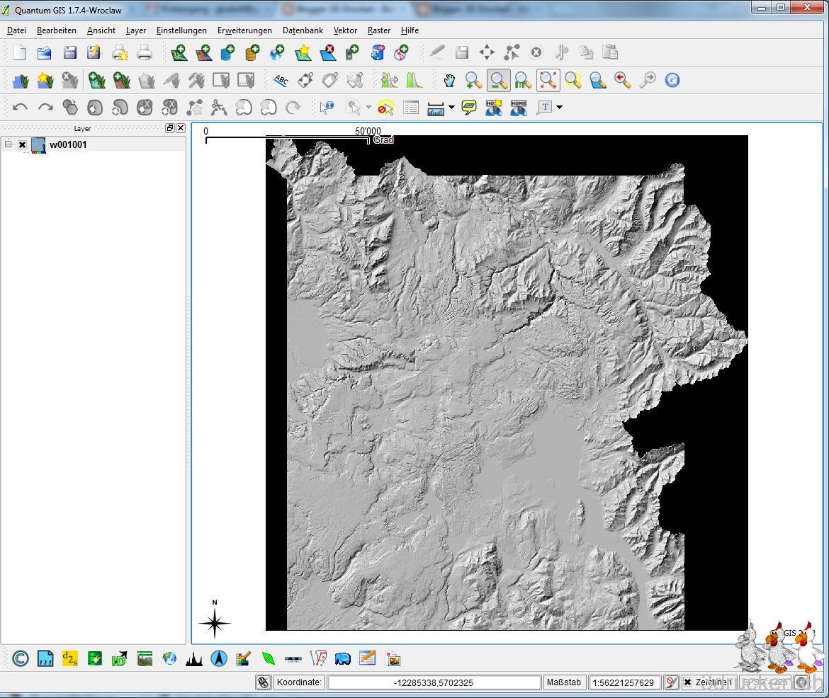 Geöffnet wird das Arc/Info Binary Grid Format durch Hinzufügen eines Raster-Layers mit der Datei w001001.adf aus dem Unterverzeichnis hillshade10, bzw. hillshade30.