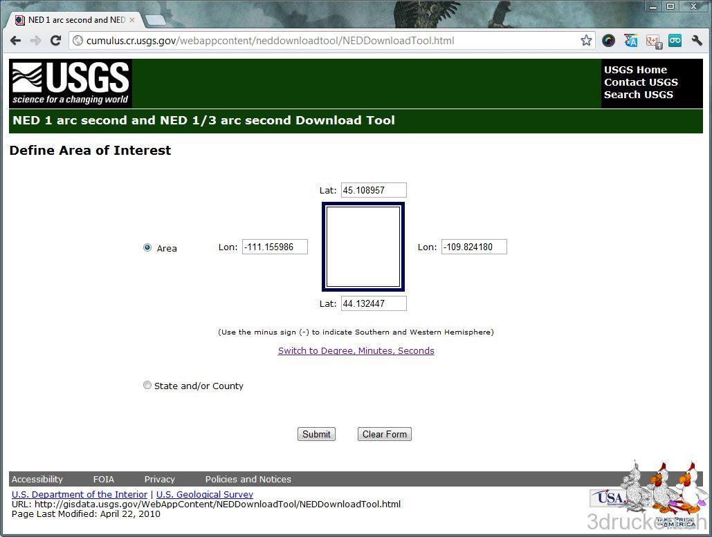 Da uns dies für unser Vorhaben, ein 3D-druckbares Relief zu erstellen, nicht viel bringt, laden wir die Quelldaten direkt vom Server des USGS herunter und stellen selber das Mosaik zusammen. Entweder können die Daten vom NED Download Tool bei USGS heruntergeladen, oder aber als WMS (Web Map Service) z.B. direkt in QGIS eingebunden werden. Die Adressen zu den WMSs von USGS finden sich auf der Webseite von ned.usgs.gov. Wir entscheiden uns für den Download, damit wir die Daten auch bearbeiten können.