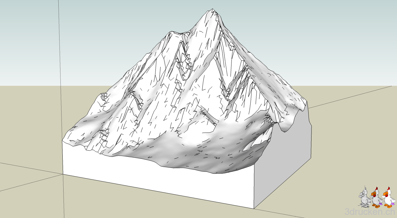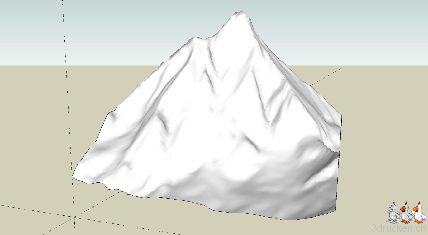 Bei der Präsentation habe ich nach dem Generieren eine horizontale Schnittebene eingefügt. Damit kann man prima das Prinzip von Höhenkurven darstellen. Hier gibt es das Modell im SketchUp-Format (Quelle: Bundesamt für Landestopografie)