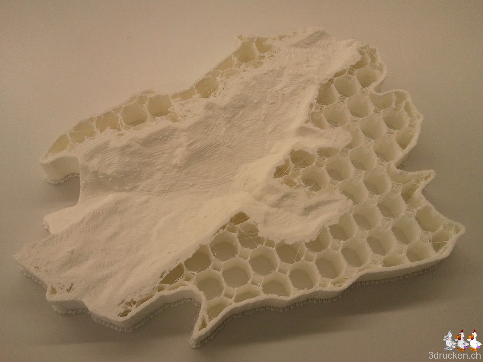 So nach ca. 10-15 h streikt unser 3D-Drucker jeweils leider. Hier die letzten 2 Druckversuche des Reliefs von Grindelwald by gluetolf. Beim Ersten war das Material auf der Rolle fast aufgebraucht und dadurch der Widerstand beim Vorschub zu gross, beim Zweiten hat das transparente BfB-PLA einfach beschlossen im Plastikschlauch drin mehrfach zu brechen und nicht mehr weiter von der Rolle zu kommen. Wir durften danach zum ersten Mal kleine Bruchstücke PLA aus dem Schlauch entfernen.
