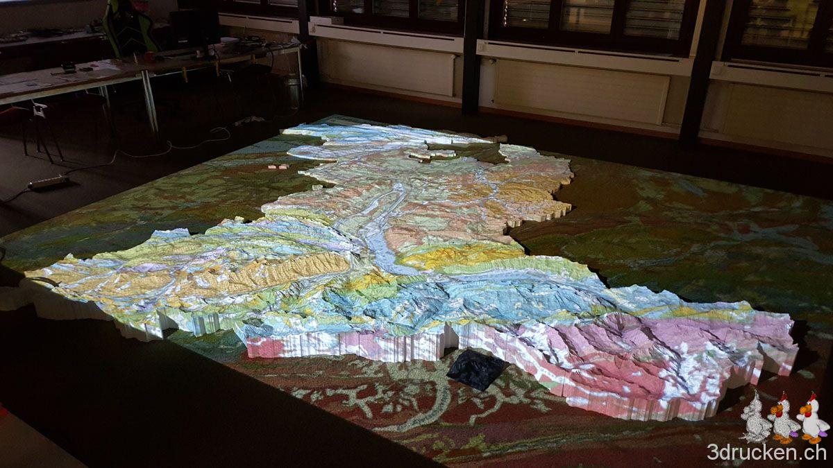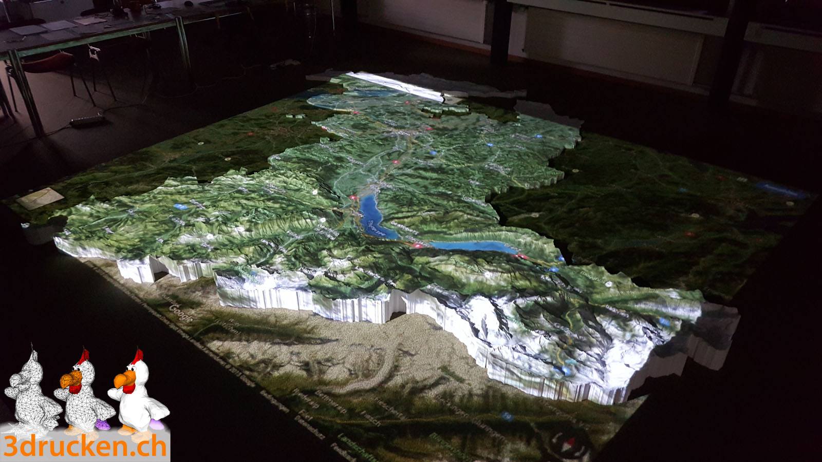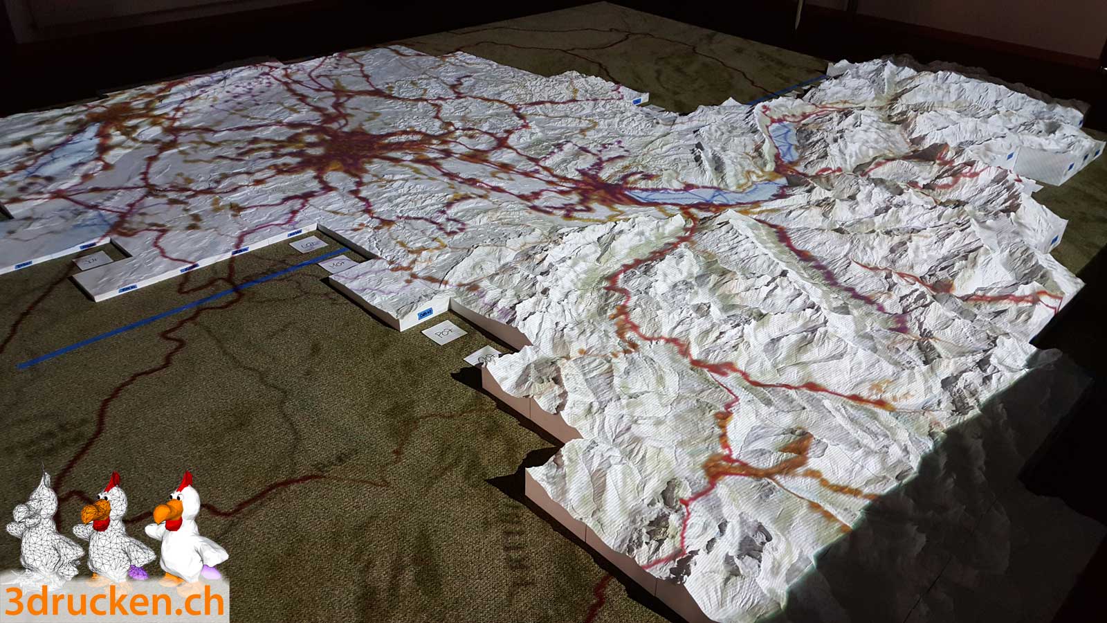 Die Einzelteile werden zusammengefügt, und bilden so die Basis für eine Multimedia-Installation, bei der mittels Projektor, digitale räumliche Daten wie z.B. Satellitenbilder, Luftbilder, thematische Karten, Strömungsanimationen oder Zugbewegungen über das Relief gelegt werden. Das Relief wurde erstellt, um die technische Machbarkeit zu prüfen, und um die Datenqualität der swissALTI3D-Daten zu zeigen. Es wird 2019 in zwei Seminarräumen der PHBern an den Wänden montiert, und wird da für die Ausbildung von Geographielehrern eingesetzt werden.