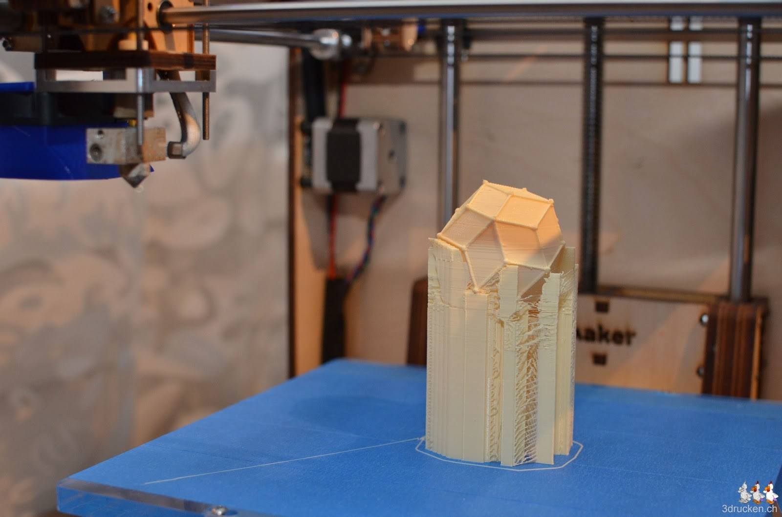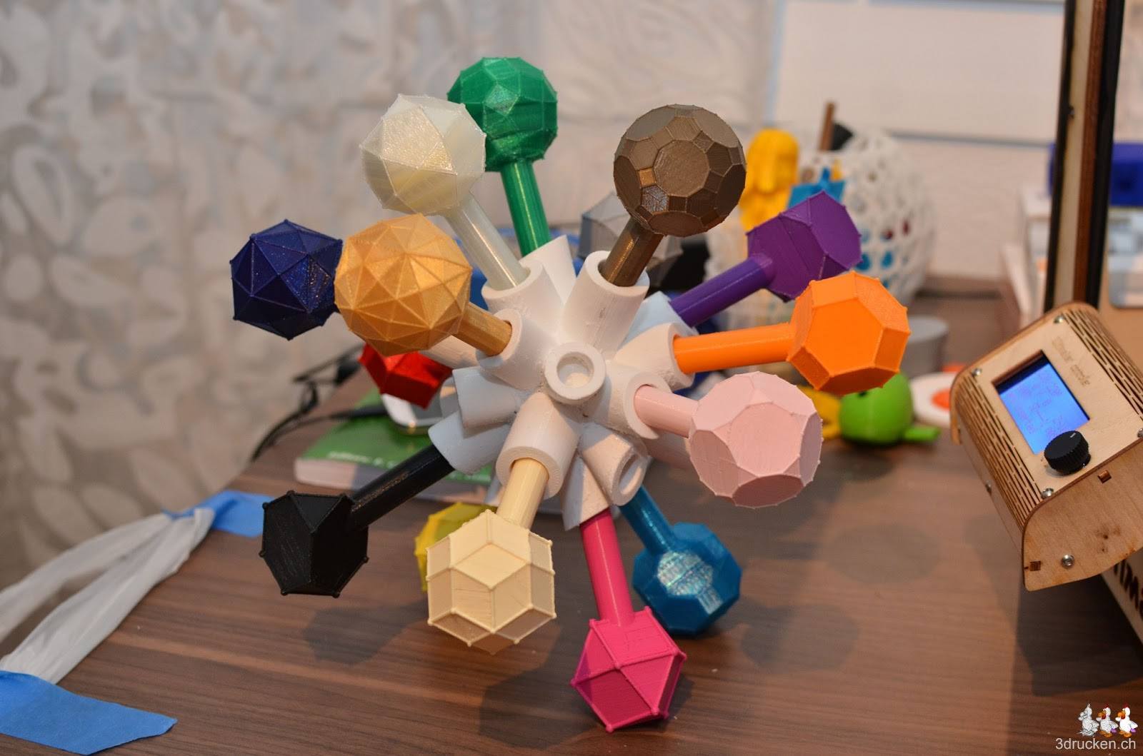 Beim Druck des Rhombentriakontaeder blieben gerade mal 40 cm Filament beim Extruder übrig, das war wirklich Glück. Eine neue Rolle Filament hatten wir bereits auf die Rollenhalterung bereitgelegt, für den Fall, dass wir damit die erste Farbe weiterstossen müssten. Der Rhombus als Flächenform gefällt uns sehr gut, und auf diesem Catalanischen Körper gibt es gleich 30 davon.