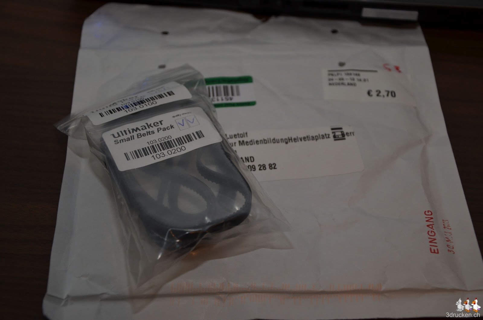 Nach etwas mehr als einer Woche ist heute das Ersatzriemen-Set von Ultimaker bei uns eingetroffen. Inzwischen konnten wir dadurch den hinteren Riemen an unserem Ultimaker zuhause ersetzen. Dies ist uns mit minimalem Aufwand gelungen. So haben wir die vorderen Verschlussklappen der Achsen enfernt und die vorderen beiden Pulleys gelöst und weiter nach hinten geschoben. Den defekten Riemen haben wir zuvor entfernt. Die Schliessblöcke vorne und hinten geöffnet und den Motor der X-Achse gelockert. So konnten wir die beiden Achsen soweit nach vorne rausschieben, damit wir hinten den neuen Riemen drüberlegen konnten. Anschliessend den Ultimaker aufgeheizt und das meiste am Druckkopf festgebrannte Filament entfernt. Nun läuft auch dieser Ultimaker wieder, und druckt schon das erste Solid A101 des The Gem.