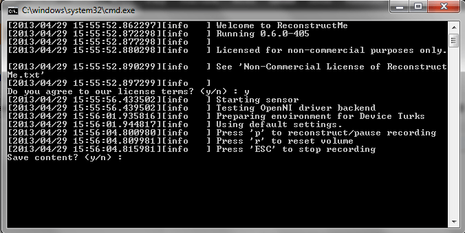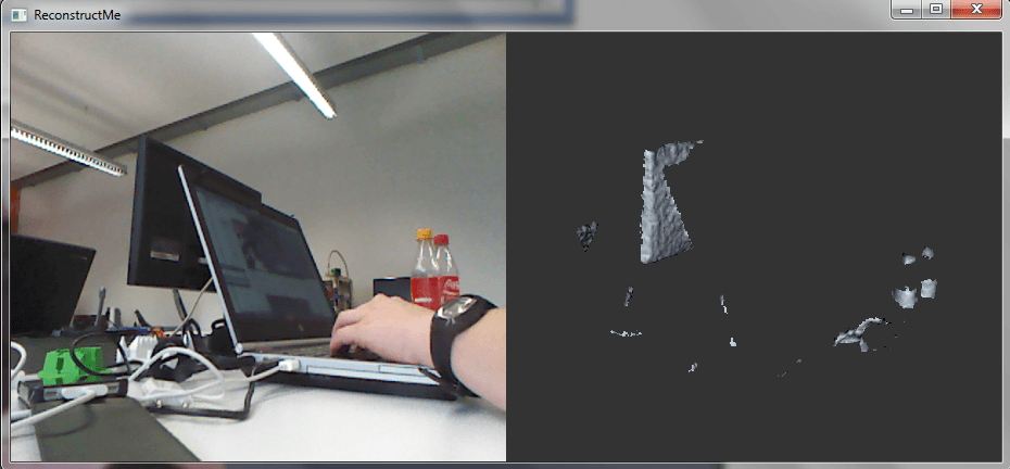 Als nächsten Schritt hängen wir die Kinect über einen freien USB-Port an den Computer. Jetzt kann ReconstructMe folgendermassen gestartet werden: